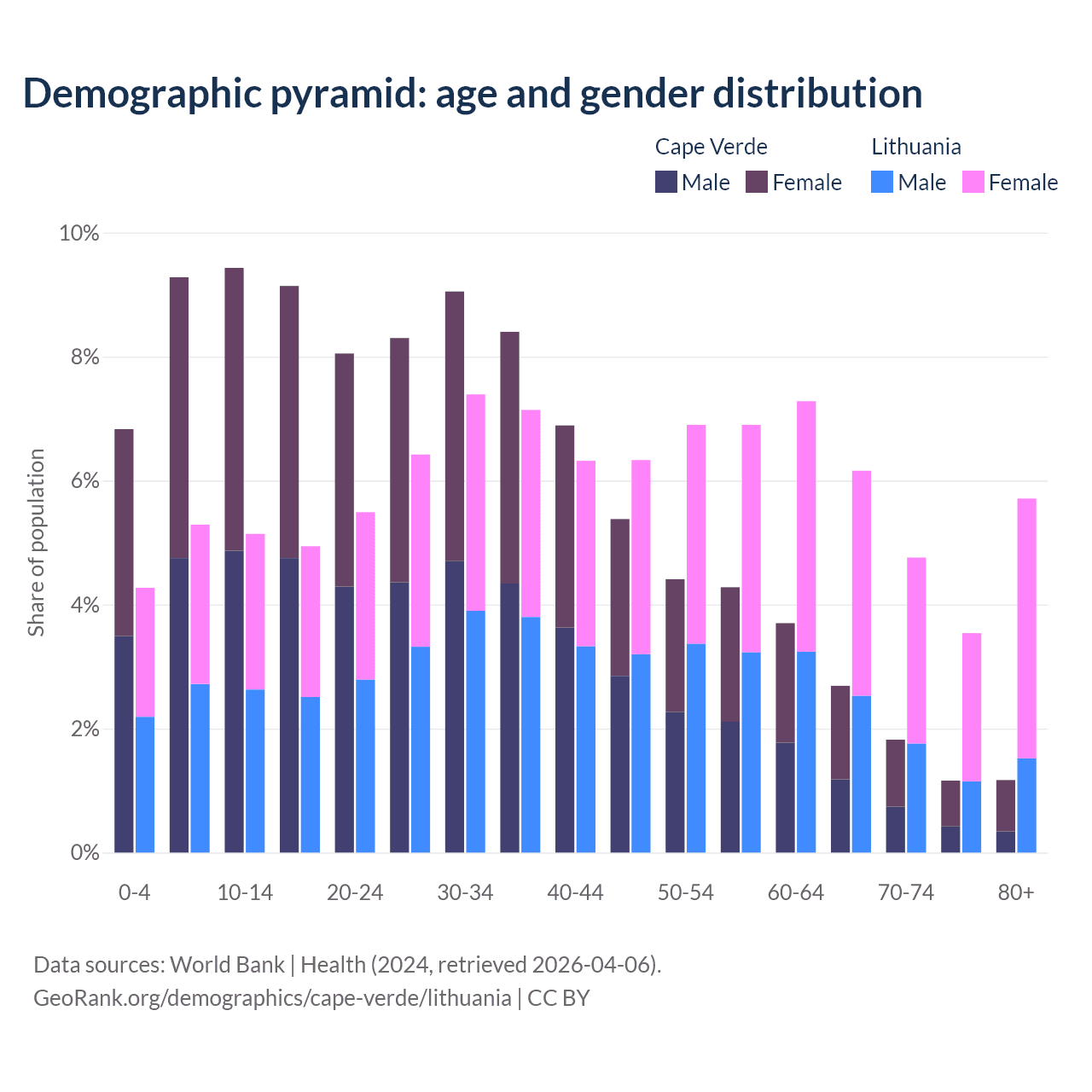 - The share of old-age demographic (65+) in Cape Verde is 6.86% vs 20.2% in Lithuania.