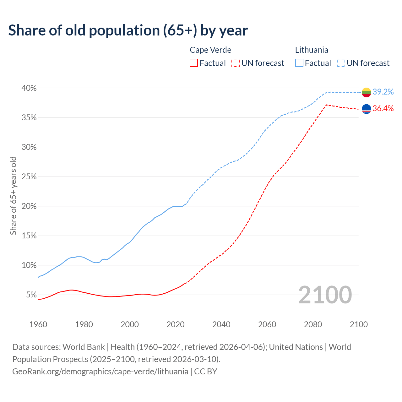 The share of older people aged 65 and over is 6.86% in Cape Verde and 20.2% in Lithuania. Life expectancy in Cape Verde compared to Lithuania .