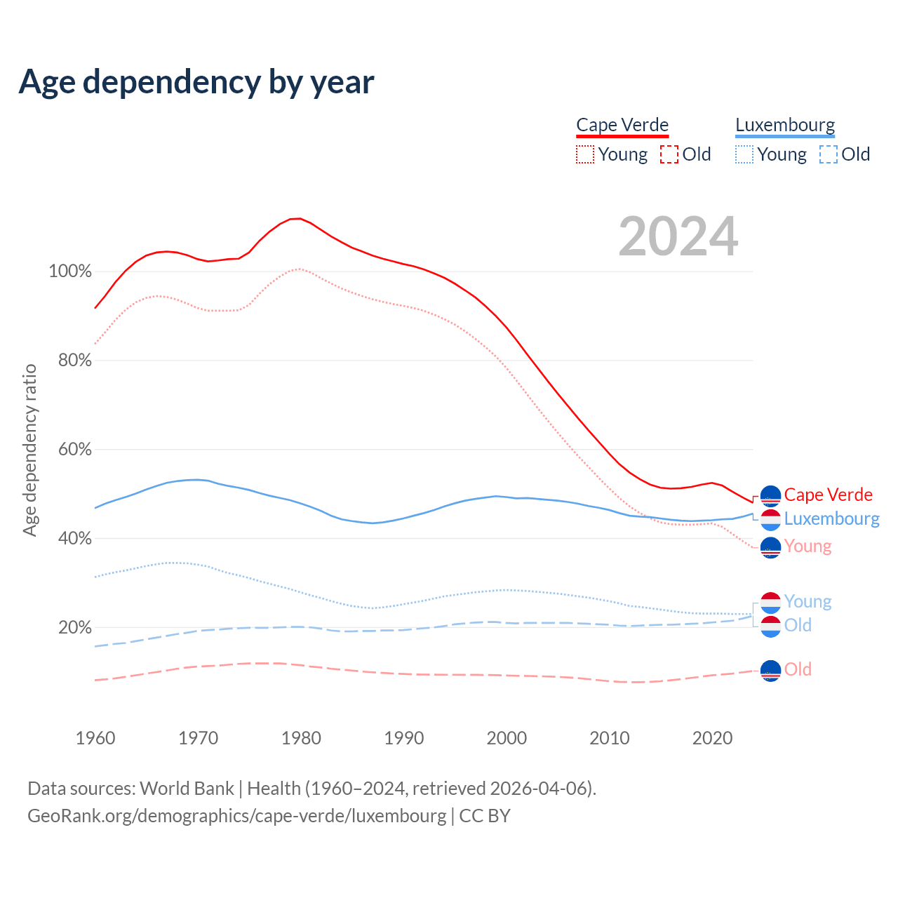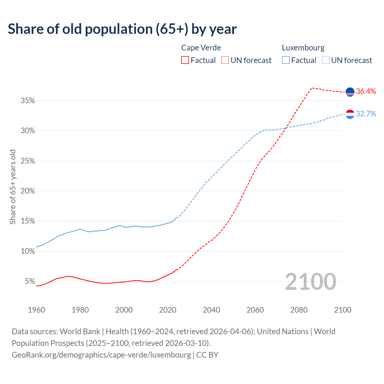 - The share of old-age demographic (65+) in Cape Verde is 6.86% vs 15.5% in Luxembourg.