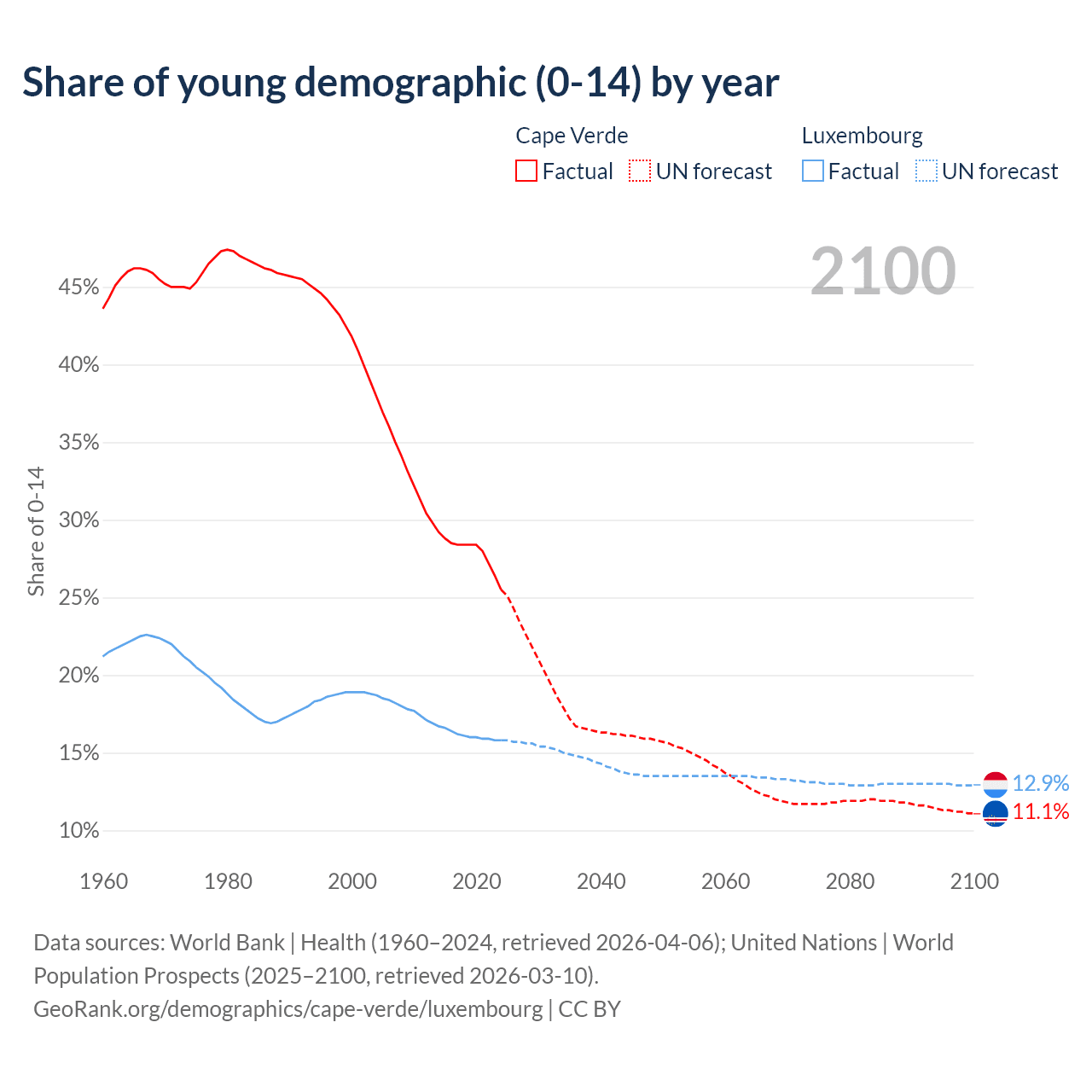 - The share of young demographic (0-15 years old) in Cape Verde is 25.5% vs 15.8% in Luxembourg.