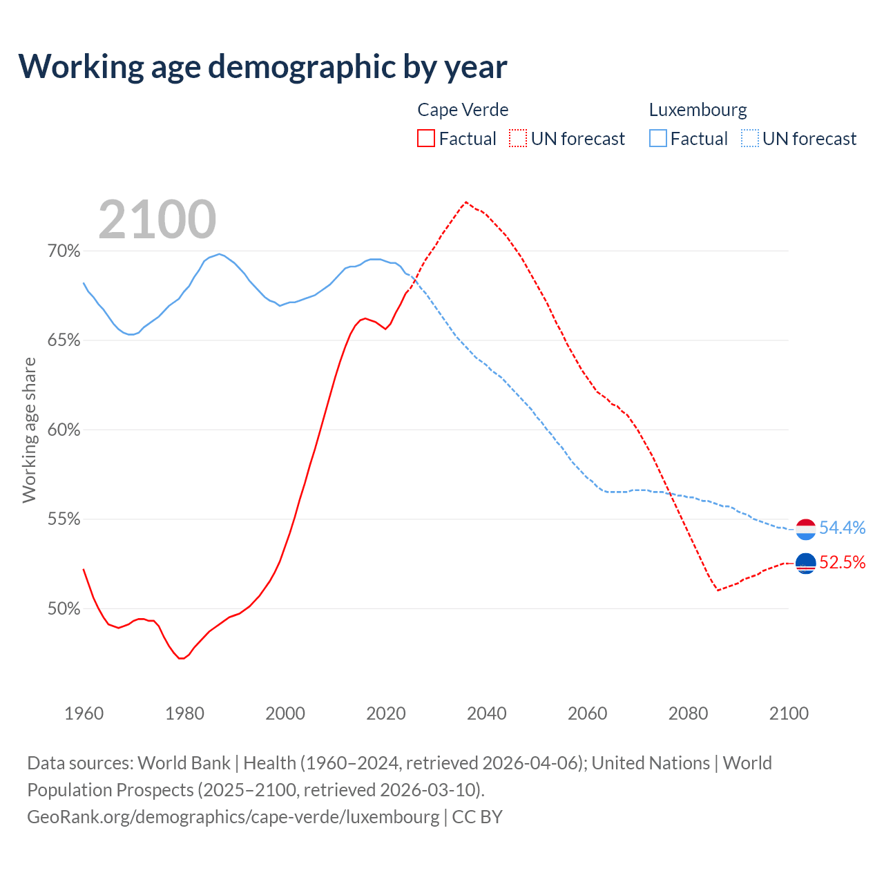 Median age Cape Verde vs Luxembourg, 1960-2100