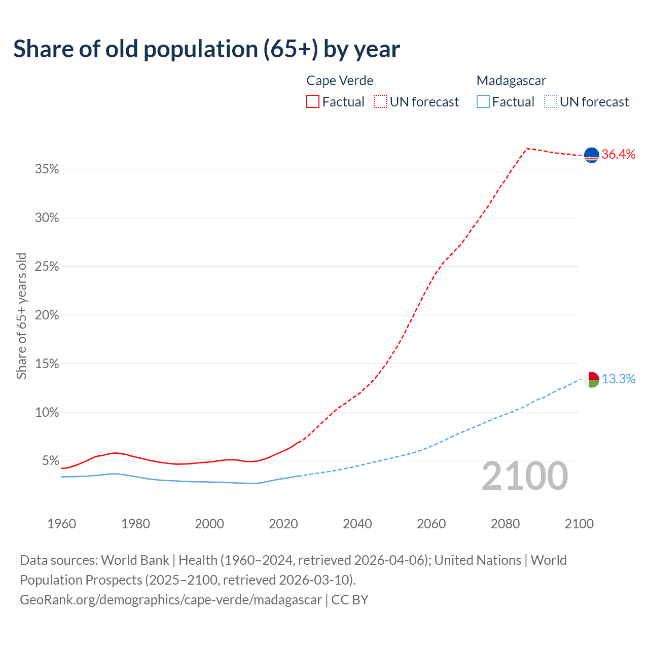 - The share of old-age demographic (65+) in Cape Verde is 6.86% vs 3.41% in Madagascar.