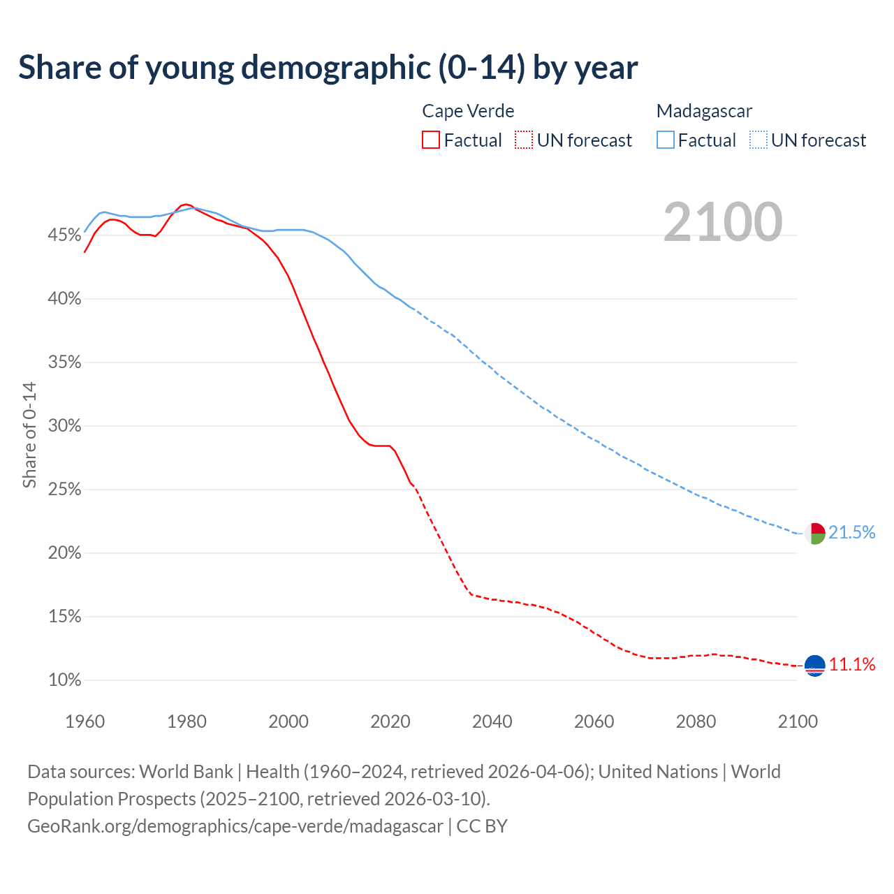 - The share of young demographic (0-15 years old) in Cape Verde is 25.5% vs 39.3% in Madagascar.