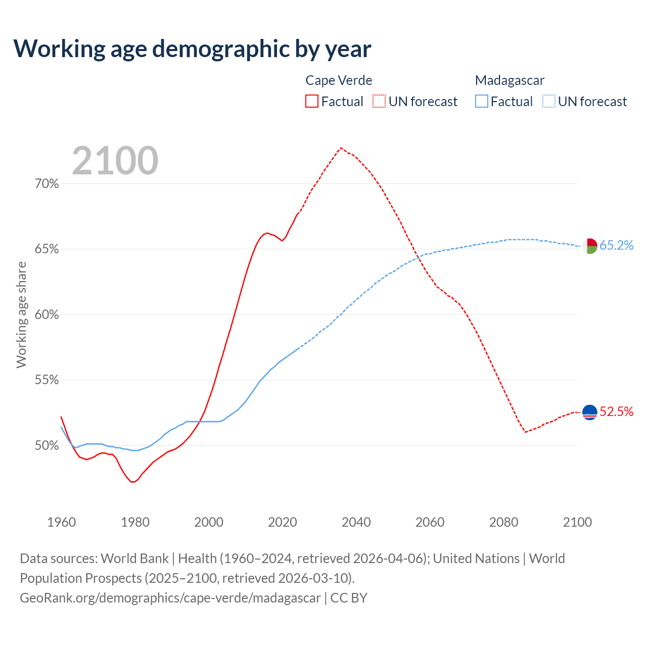 The share of older people aged 65 and over is 6.86% in Cape Verde and 3.41% in Madagascar. Life expectancy in Cape Verde compared to Madagascar .