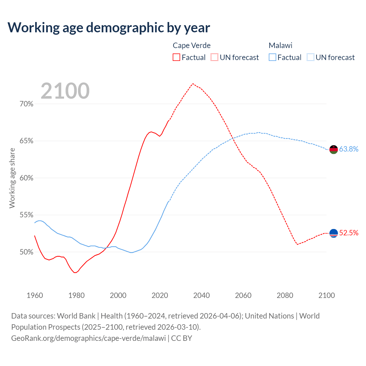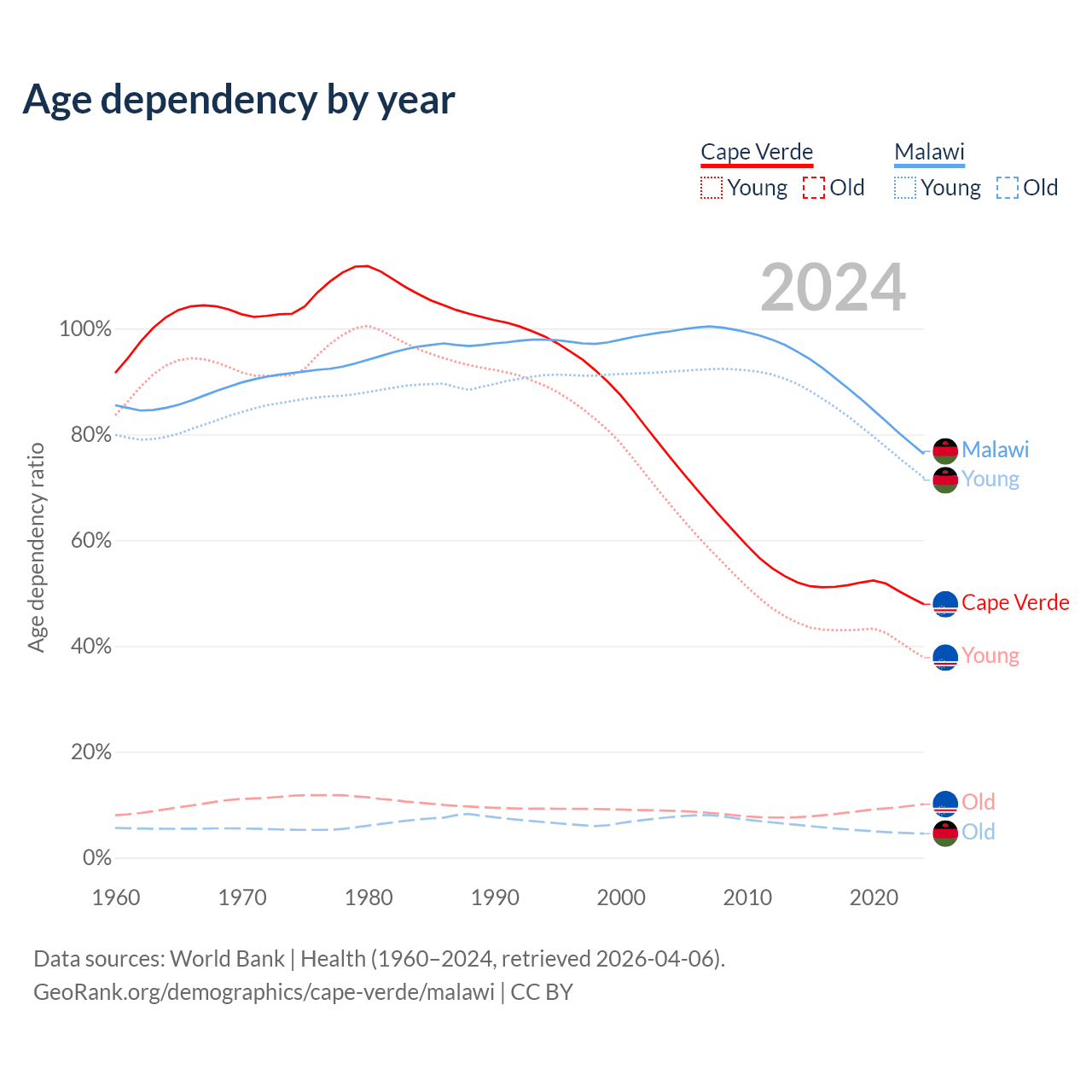 - Cape Verde is ranked 110/196 by median age (oldest to youngest) vs 181/196 for Malawi.