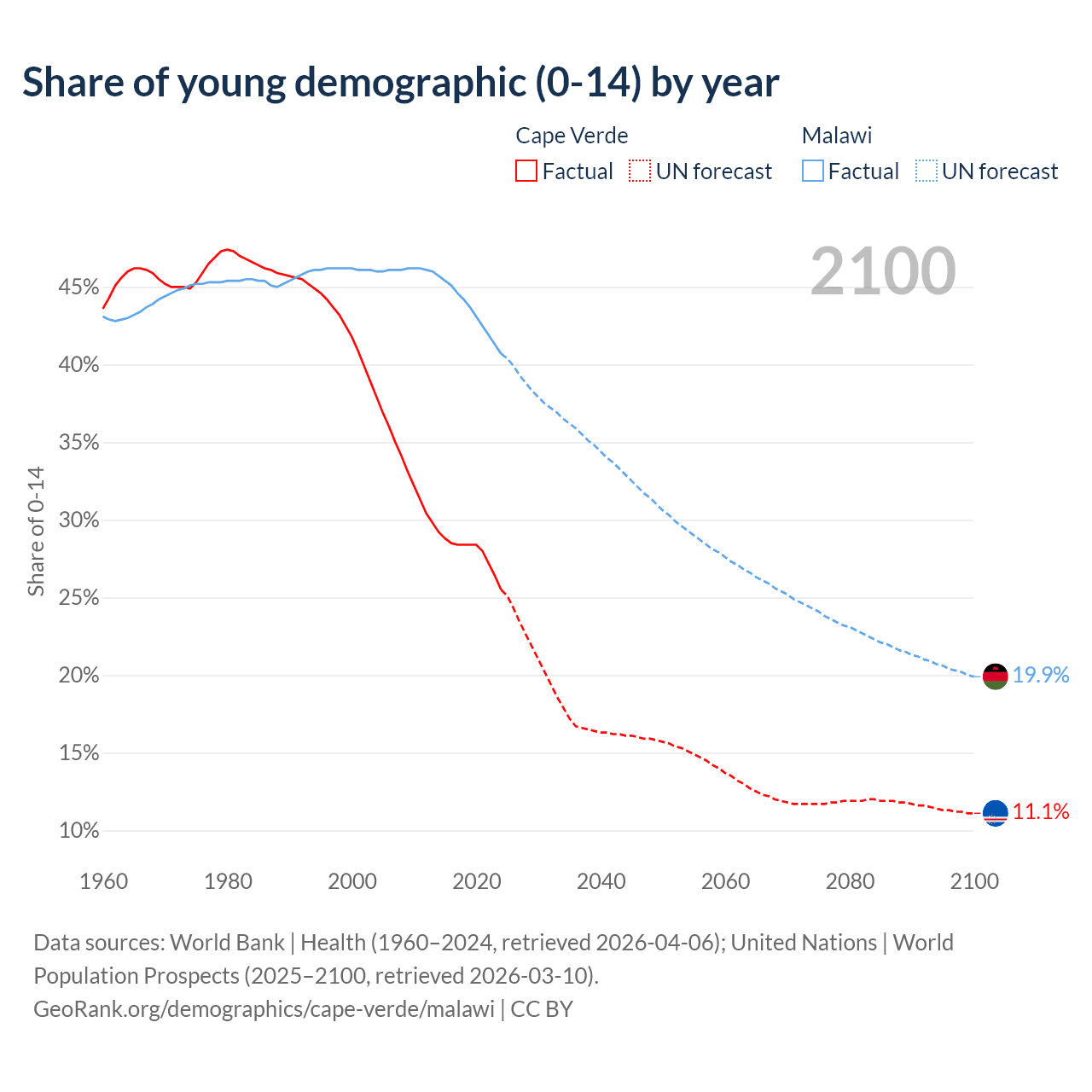 - The share of young demographic (0-15 years old) in Cape Verde is 25.5% vs 40.7% in Malawi.