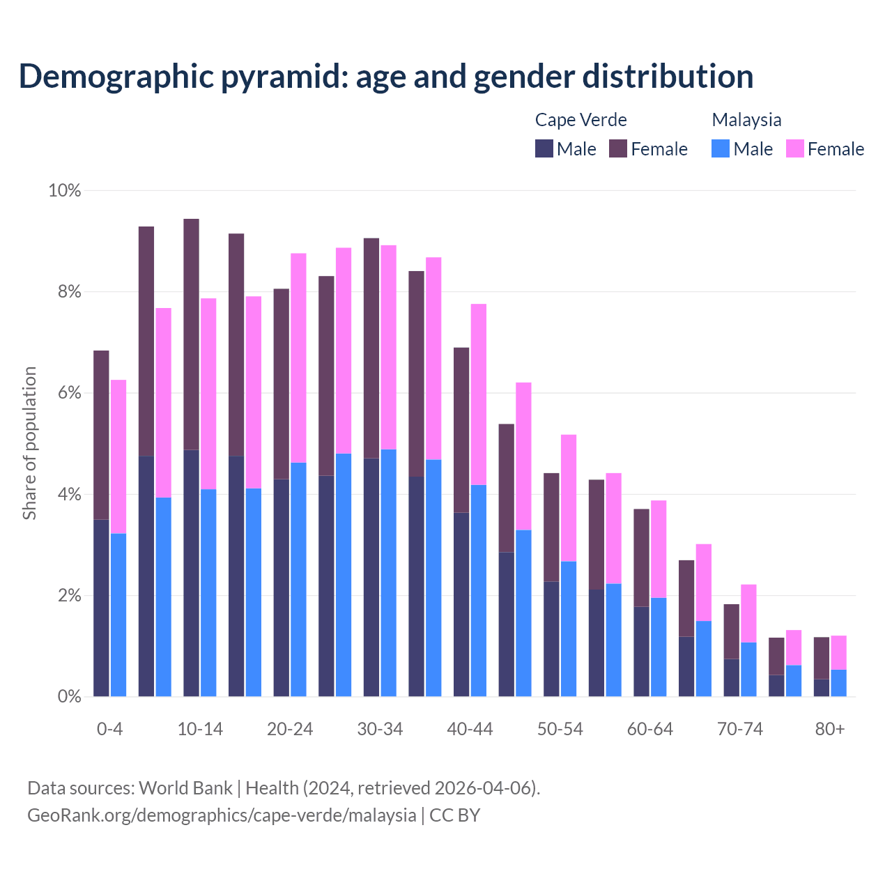 - The median age in Cape Verde is 29.4 years compared to 31.5 years in Malaysia.