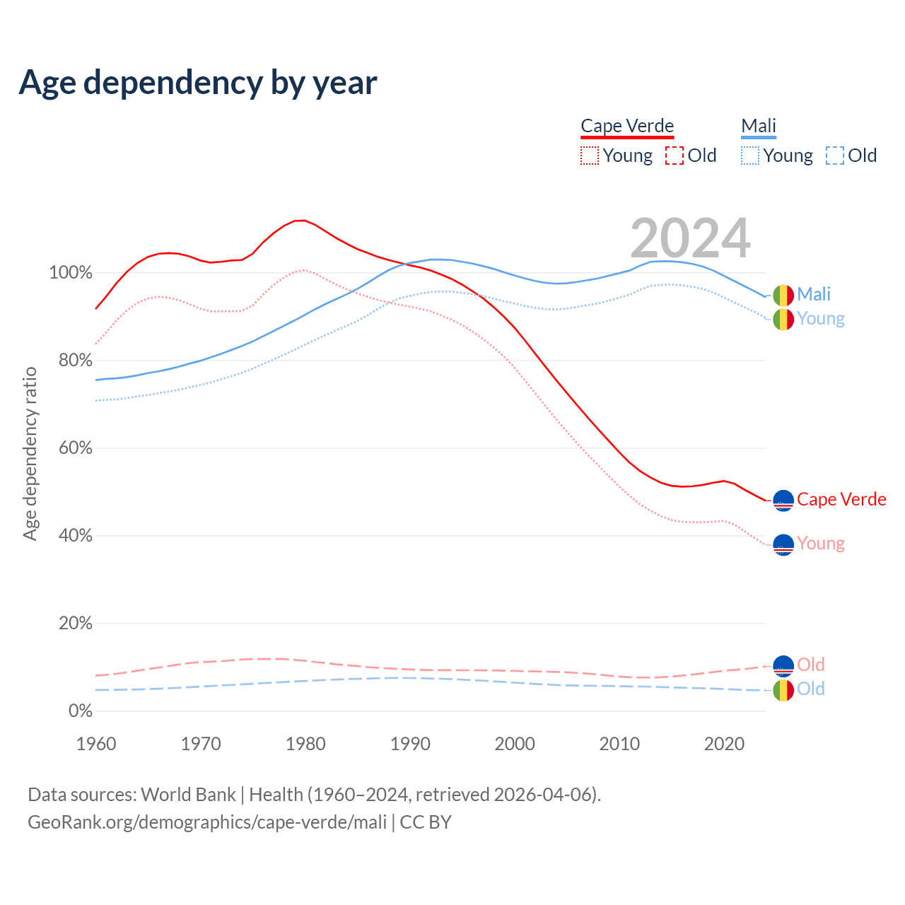 - Cape Verde is ranked 110/196 by median age (oldest to youngest) vs 193/196 for Mali.