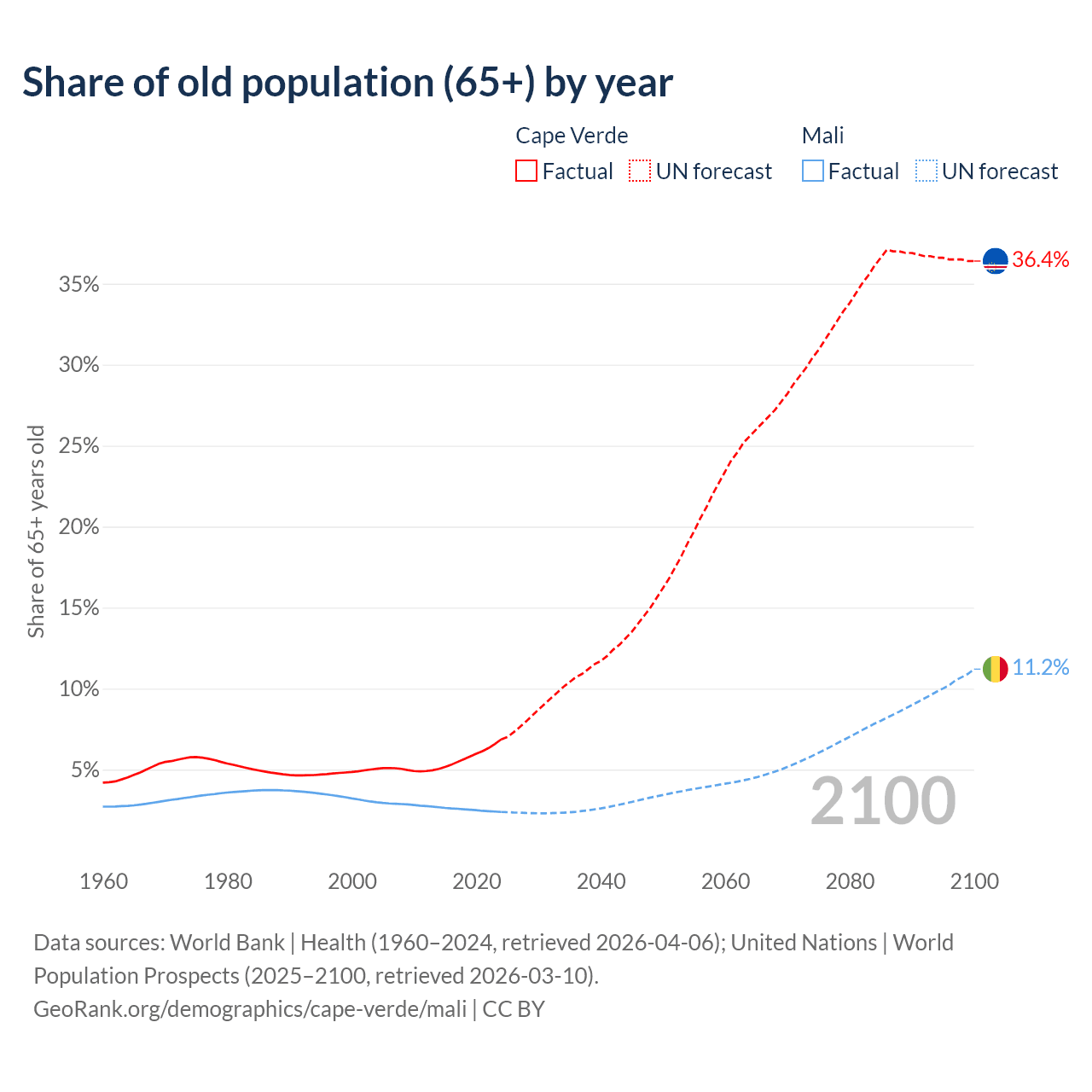 - The share of old-age demographic (65+) in Cape Verde is 6.86% vs 2.38% in Mali.