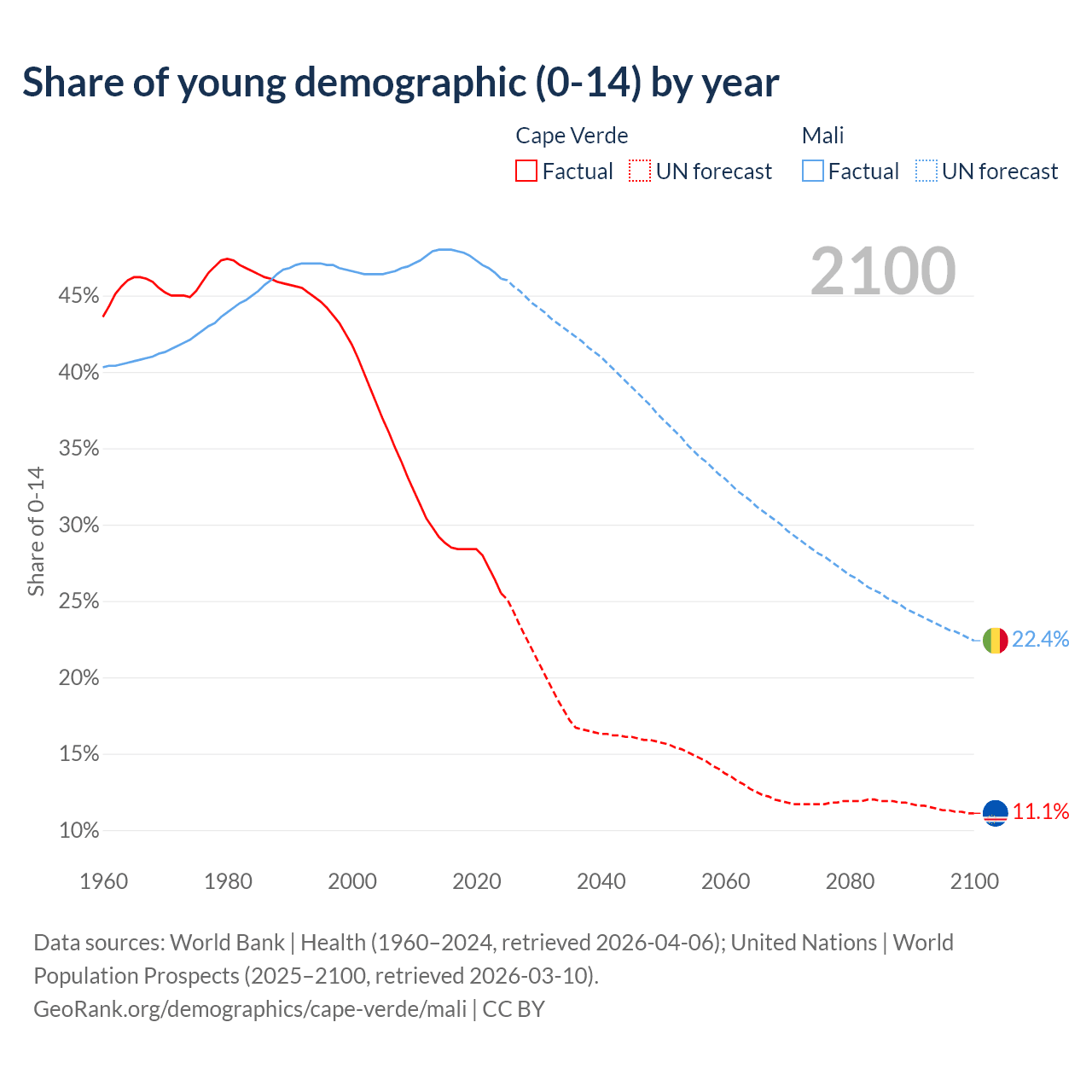 - The share of young demographic (0-15 years old) in Cape Verde is 25.5% vs 46.1% in Mali.