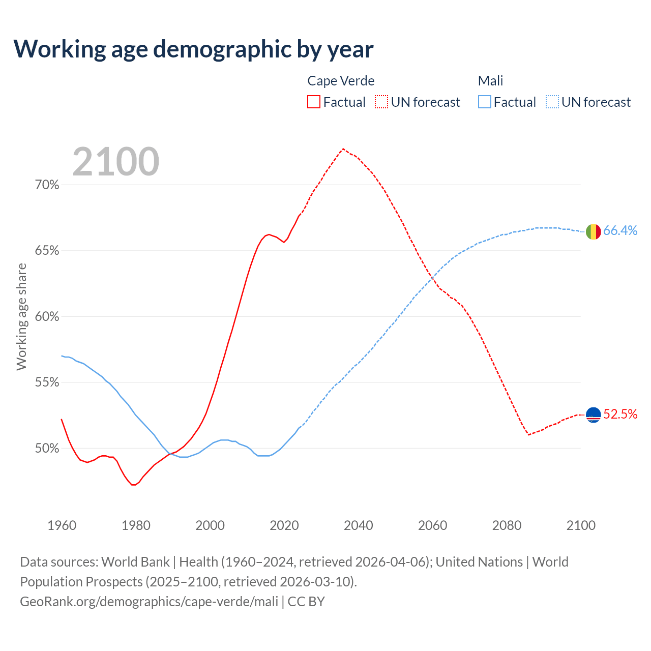 - Cape Verde has 359K working age adults (aged 15-64) vs 13.5M in Mali.