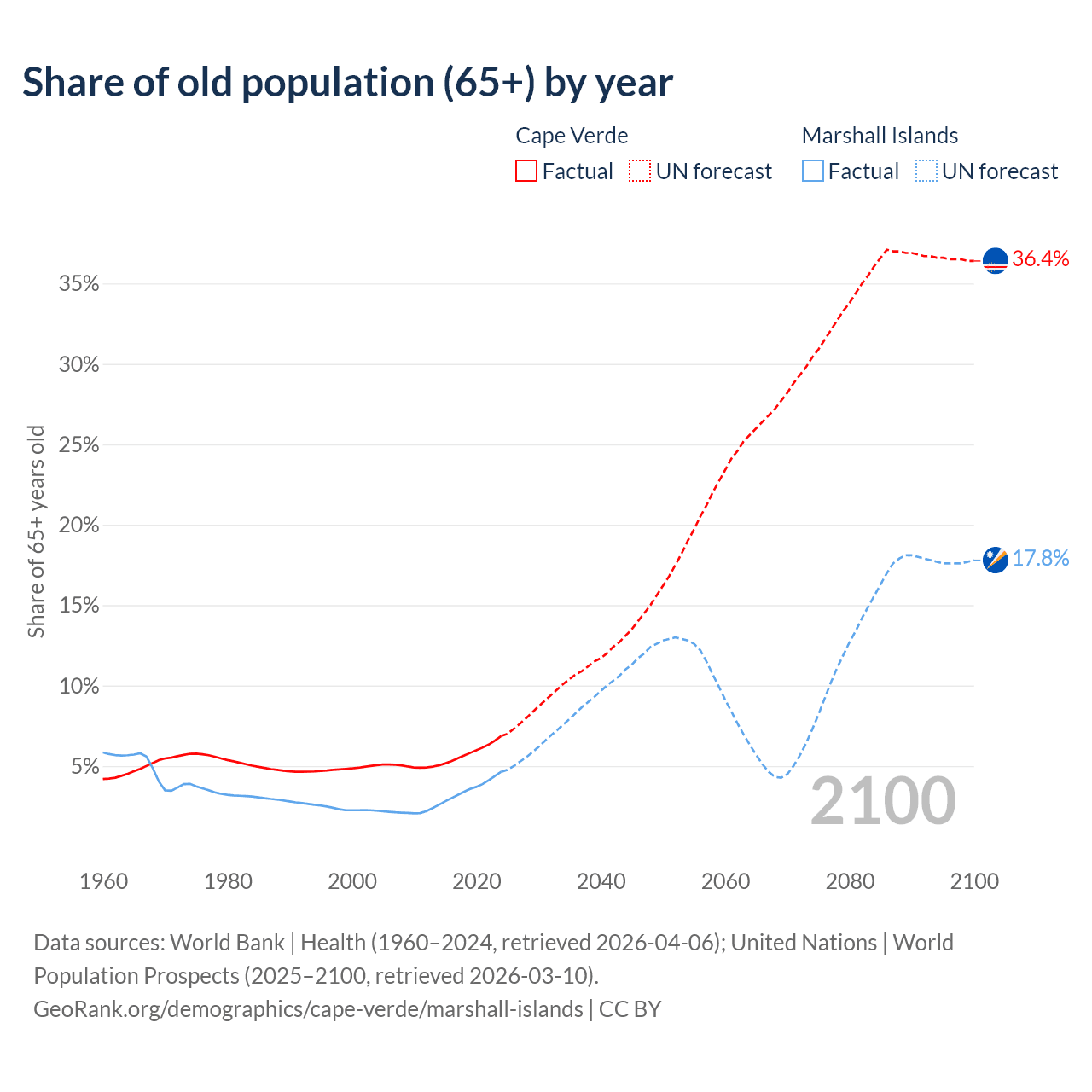 - The share of old-age demographic (65+) in Cape Verde is 6.86% vs 4.64% in the Marshall Islands.