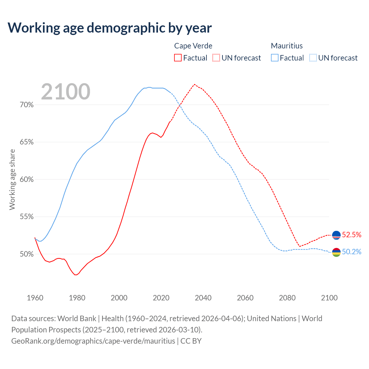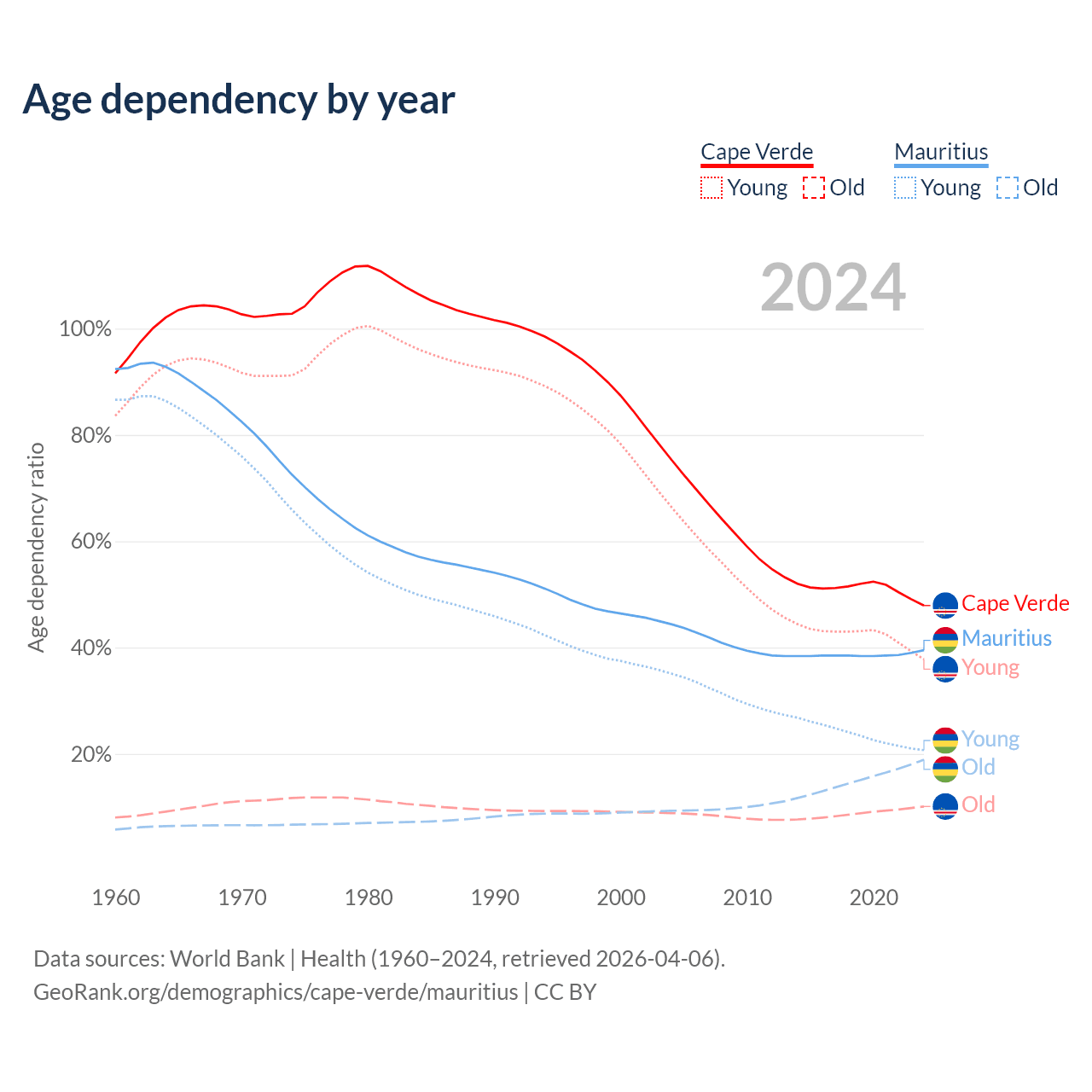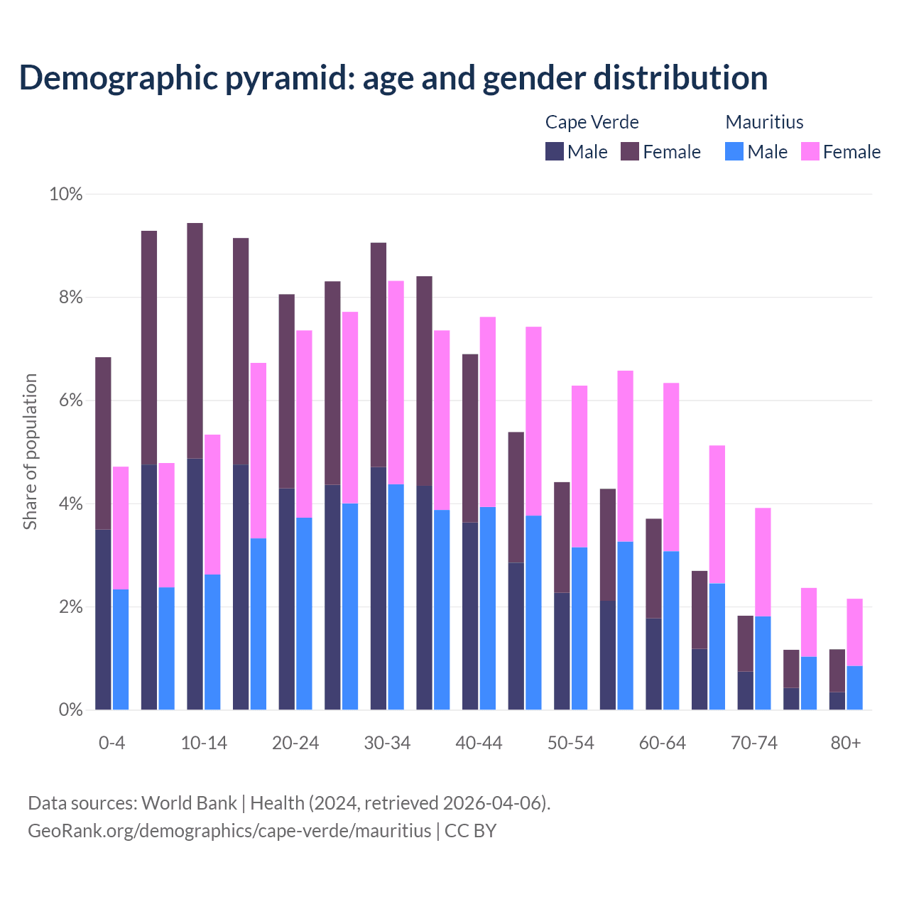 - Cape Verde is ranked 110/196 by median age (oldest to youngest) vs 57/196 for Mauritius.