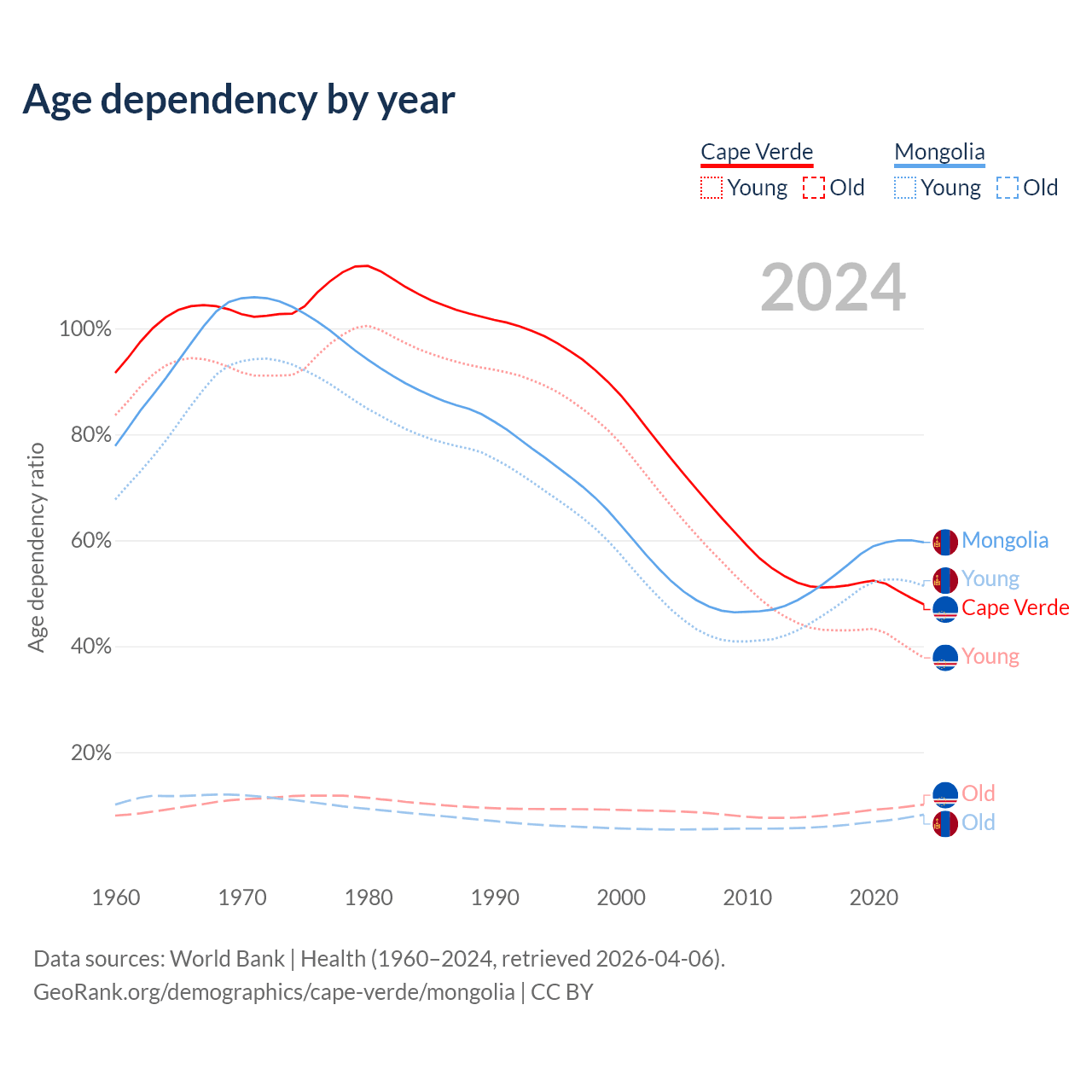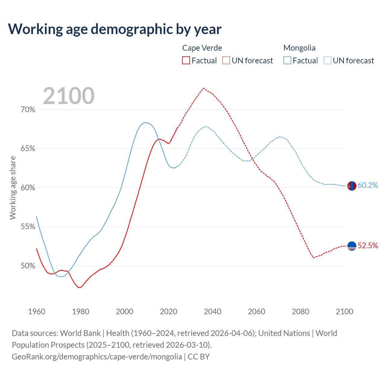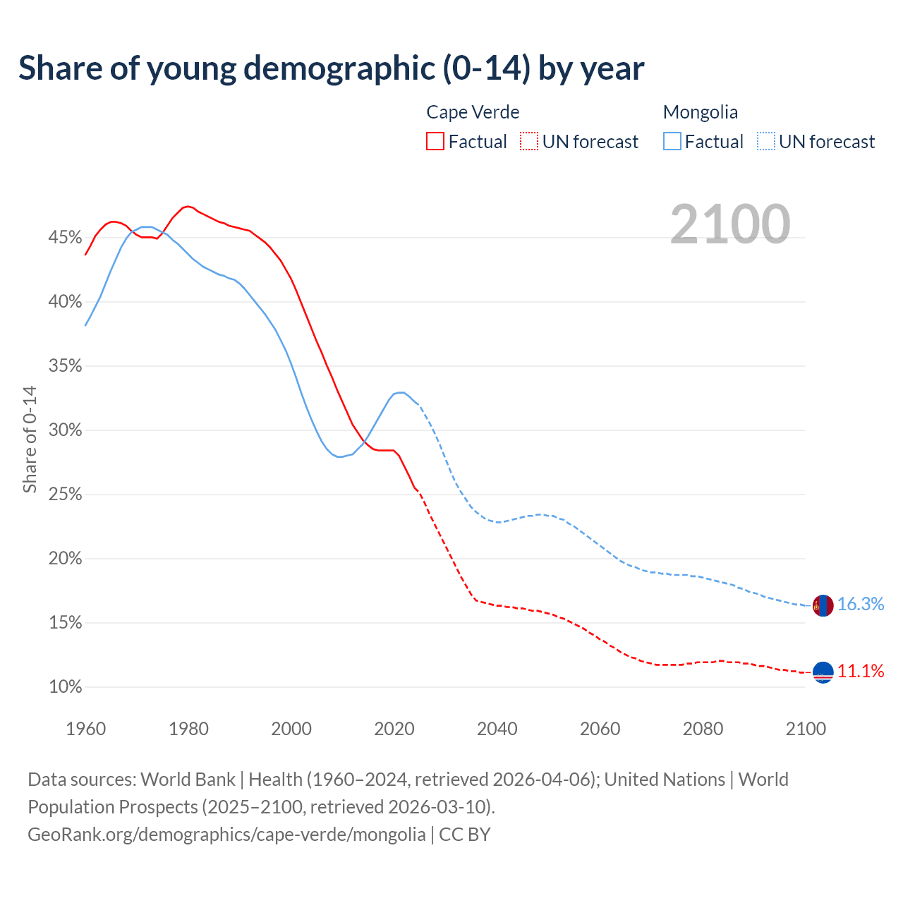 - The share of young demographic (0-15 years old) in Cape Verde is 25.5% vs 32.2% in Mongolia.