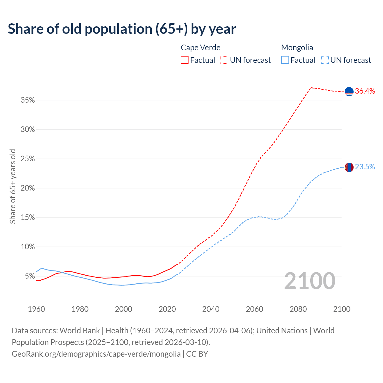 The share of older people aged 65 and over is 6.86% in Cape Verde and 5.14% in Mongolia. Life expectancy in Cape Verde compared to Mongolia .