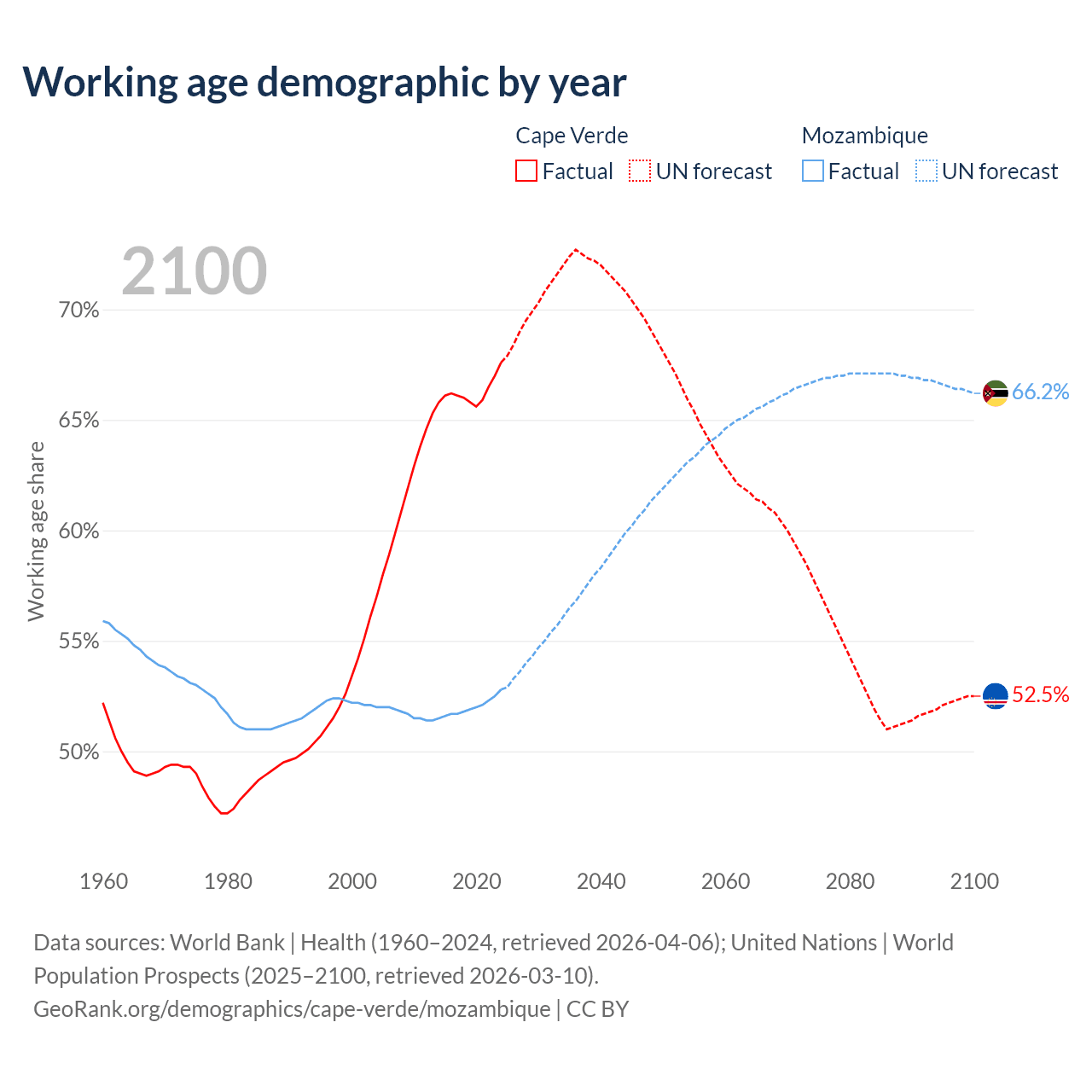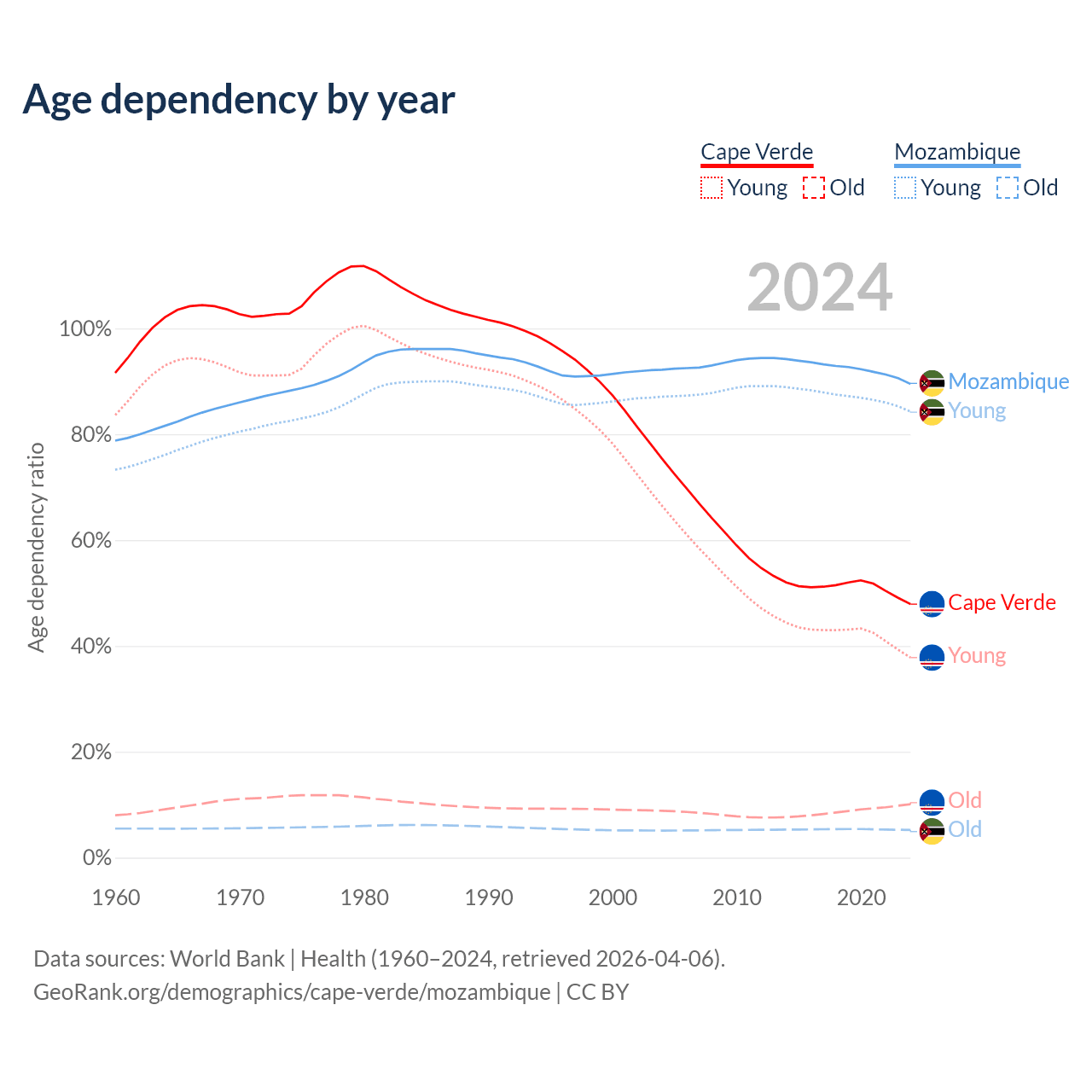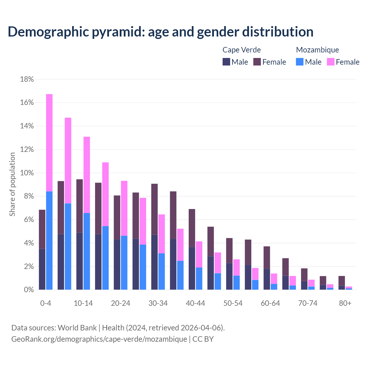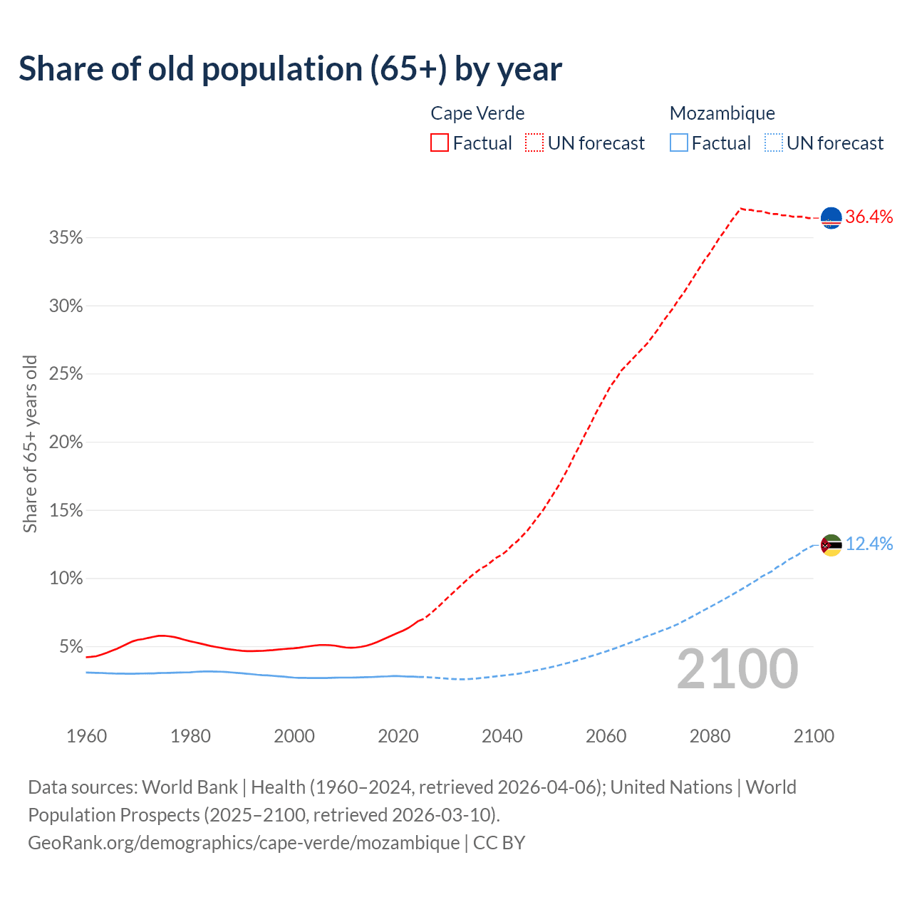 - The share of old-age demographic (65+) in Cape Verde is 6.86% vs 2.75% in Mozambique.