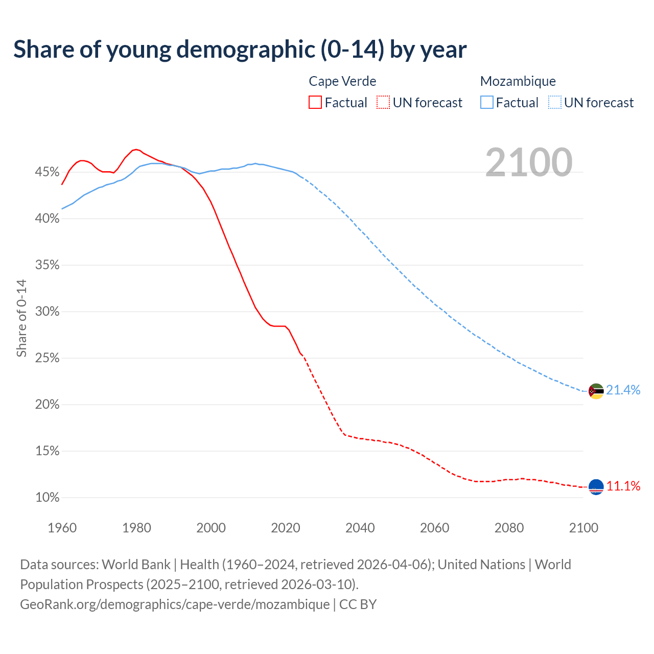 - The share of young demographic (0-15 years old) in Cape Verde is 25.5% vs 44.5% in Mozambique.