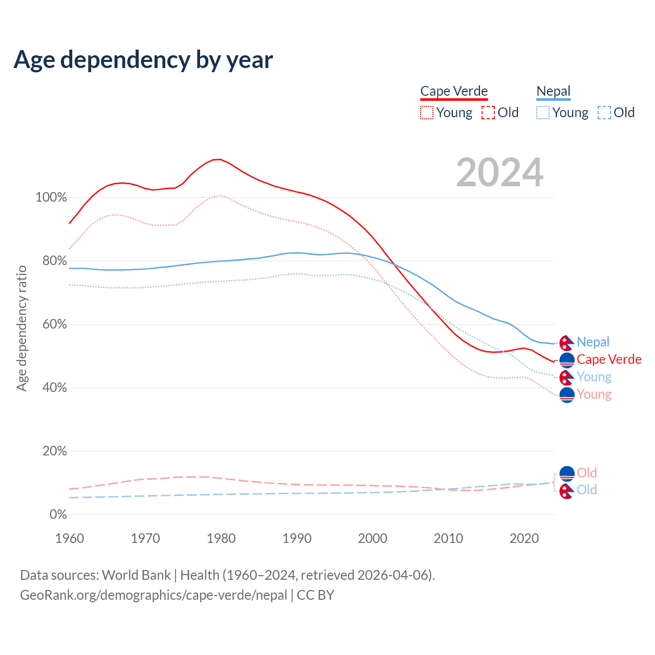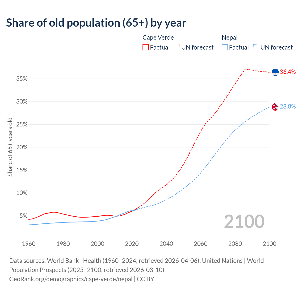 - The share of old-age demographic (65+) in Cape Verde is 6.86% vs 6.5% in Nepal.