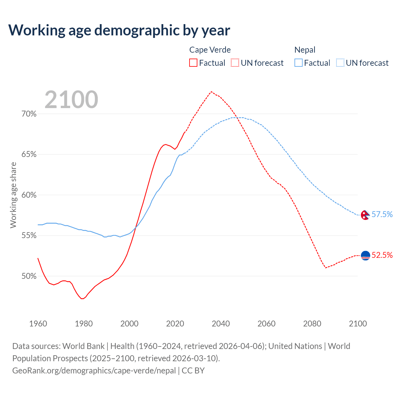 - Cape Verde has 359K working age adults (aged 15-64) vs 19.3M in Nepal.