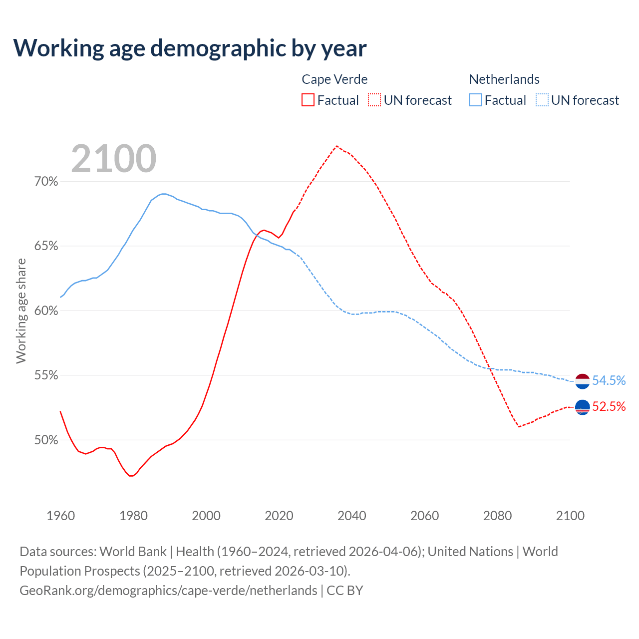 The share of older people aged 65 and over is 6.86% in Cape Verde and 20.5% in the Netherlands. Life expectancy in Cape Verde compared to the Netherlands .