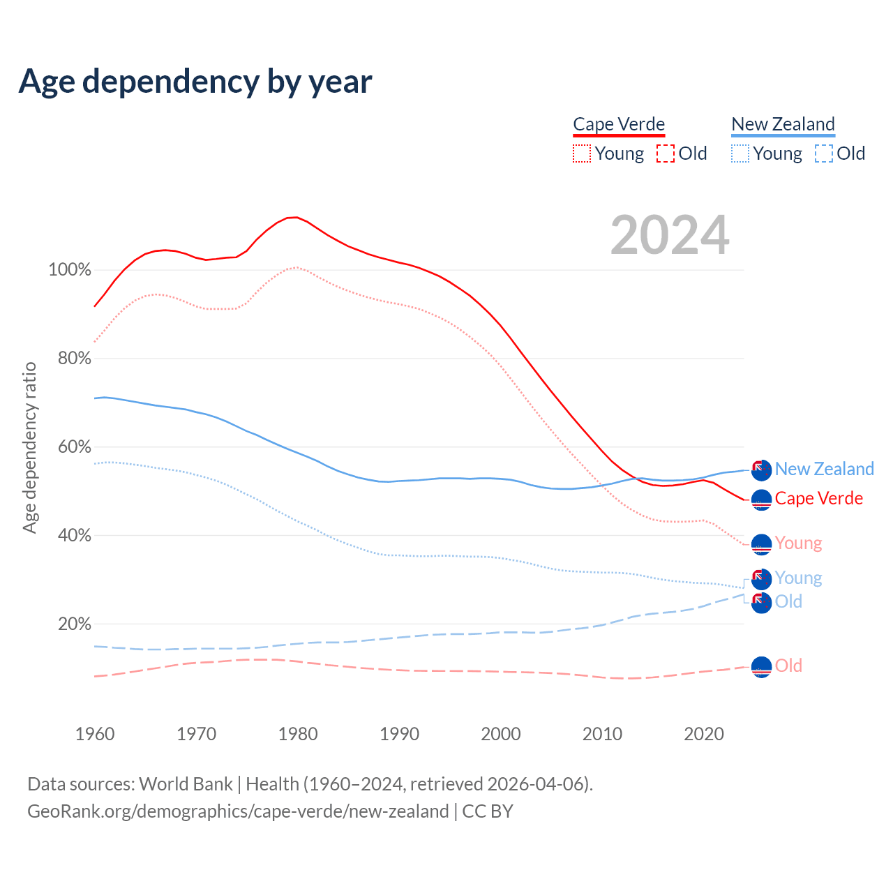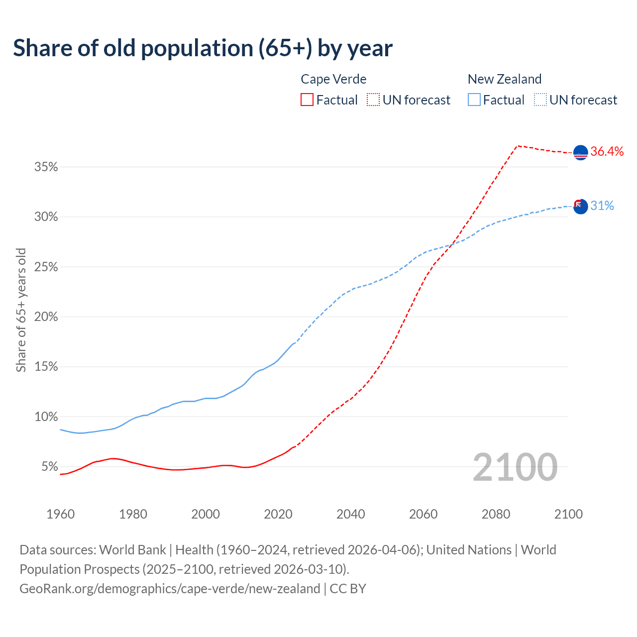- The share of old-age demographic (65+) in Cape Verde is 6.86% vs 17.2% in New Zealand.