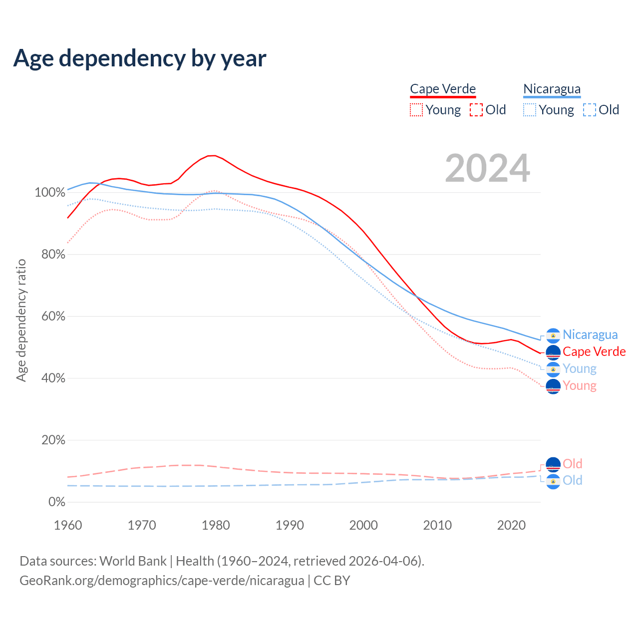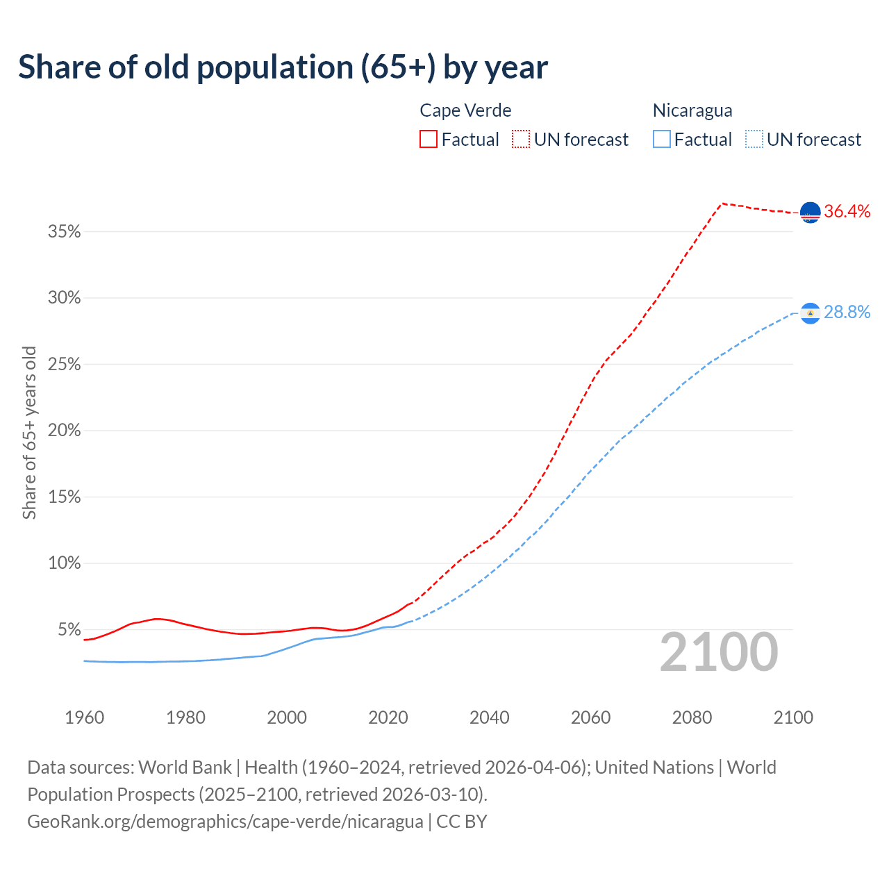 - The share of old-age demographic (65+) in Cape Verde is 6.86% vs 5.53% in Nicaragua.