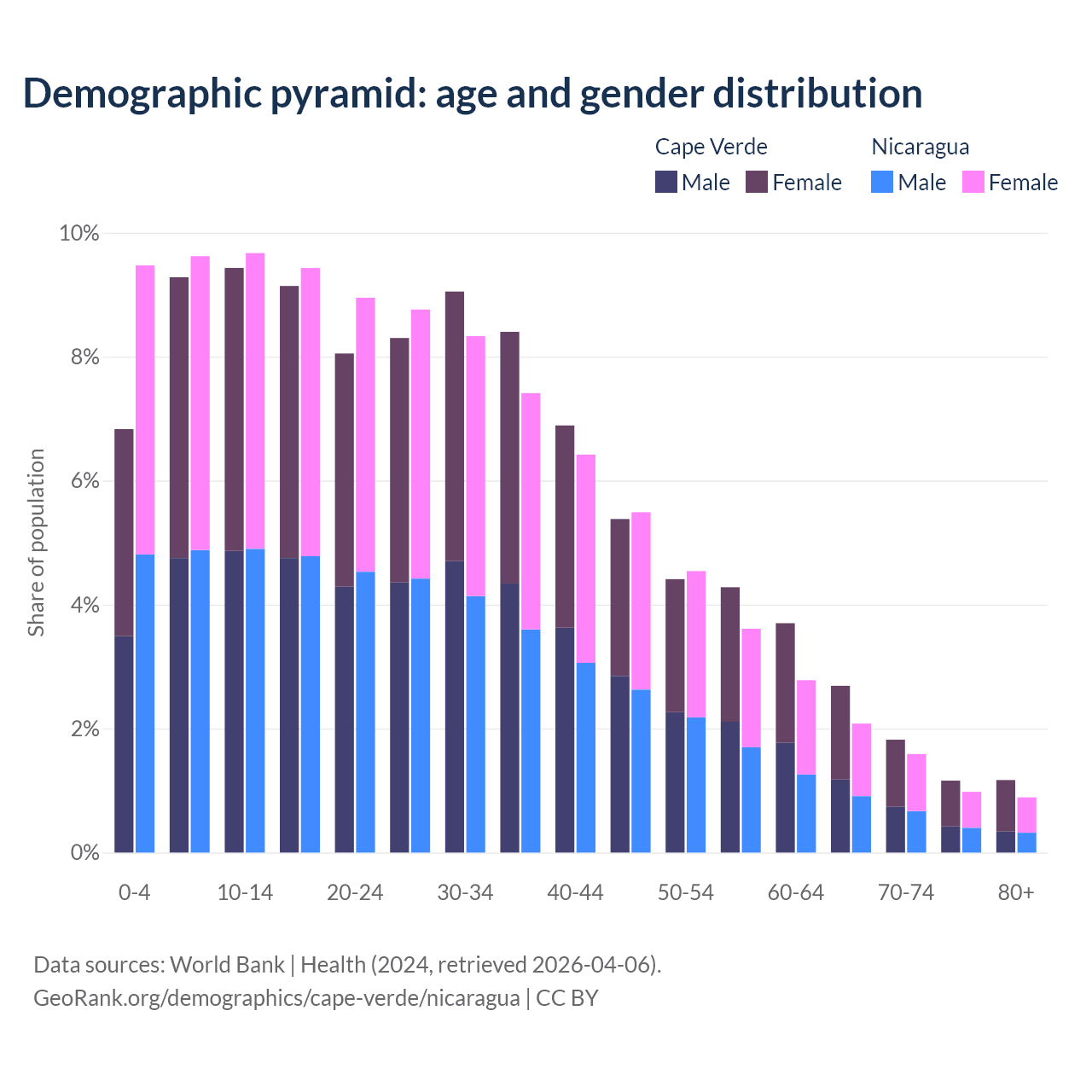 - Cape Verde is ranked 110/196 by median age (oldest to youngest) vs 125/196 for Nicaragua.
