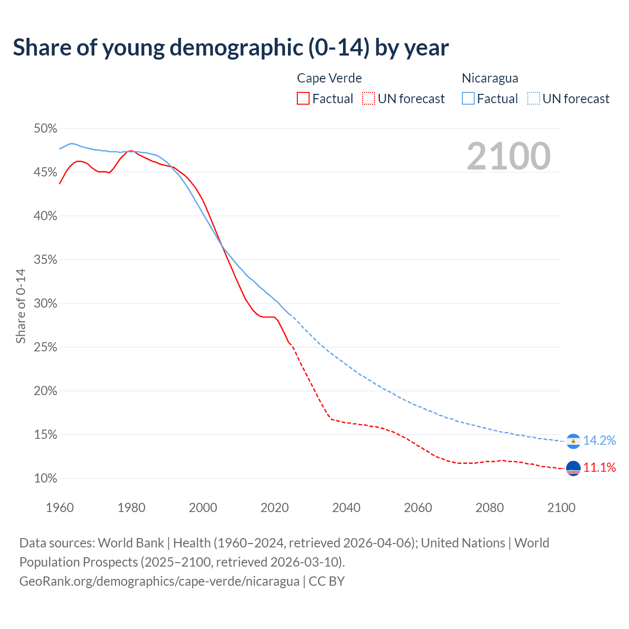 - The share of young demographic (0-15 years old) in Cape Verde is 25.5% vs 28.8% in Nicaragua.