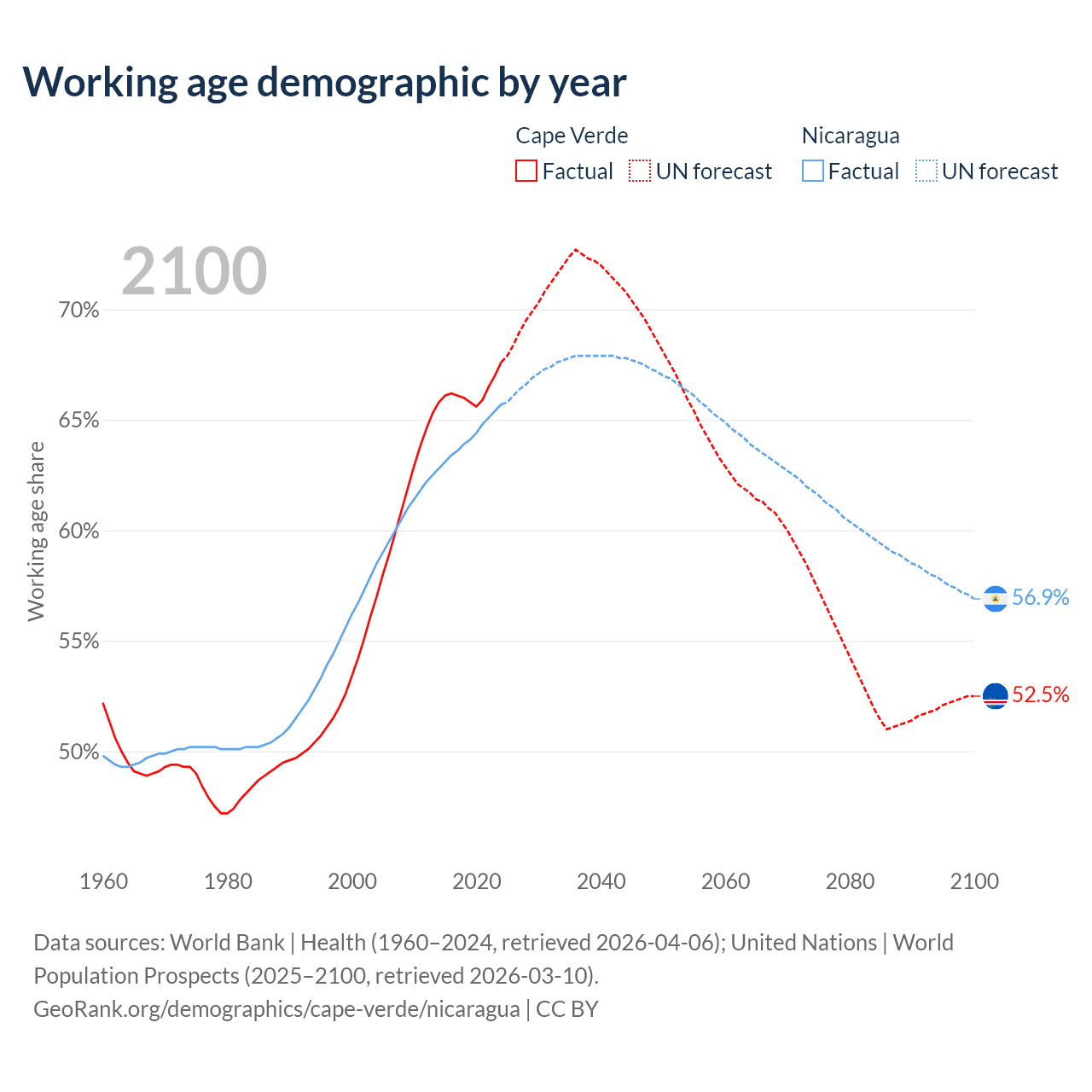 - Cape Verde has 359K working age adults (aged 15-64) vs 4.68M in Nicaragua.