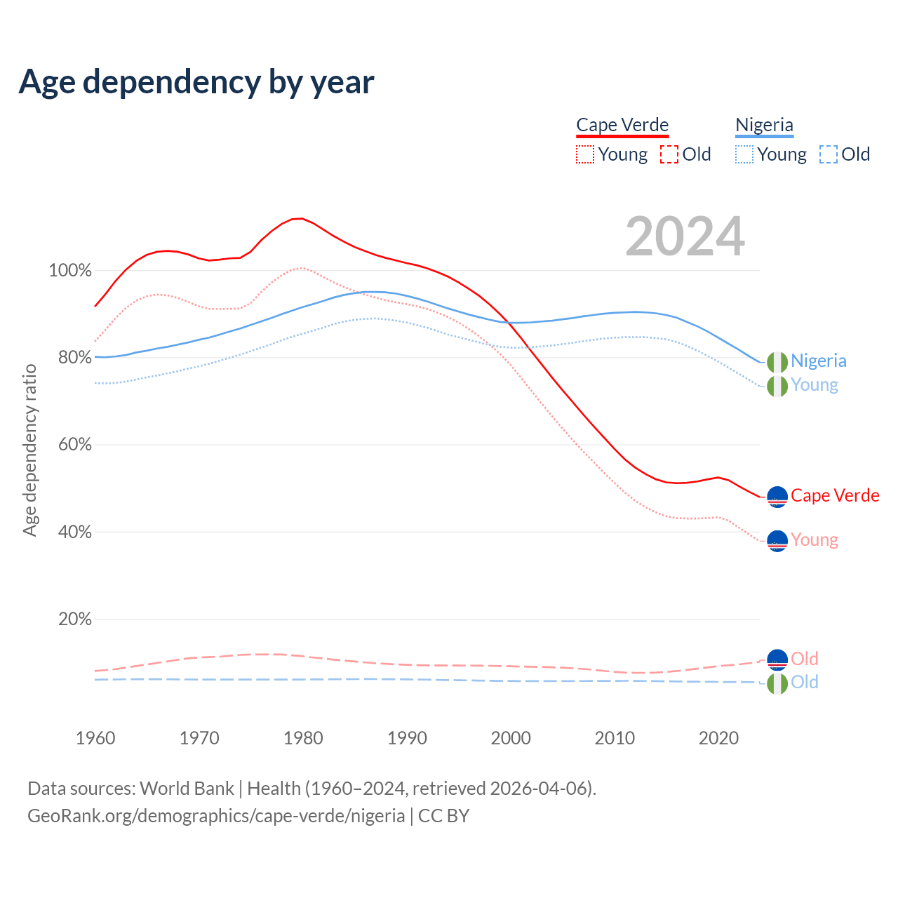 - Cape Verde is ranked 110/196 by median age (oldest to youngest) vs 178/196 for Nigeria.