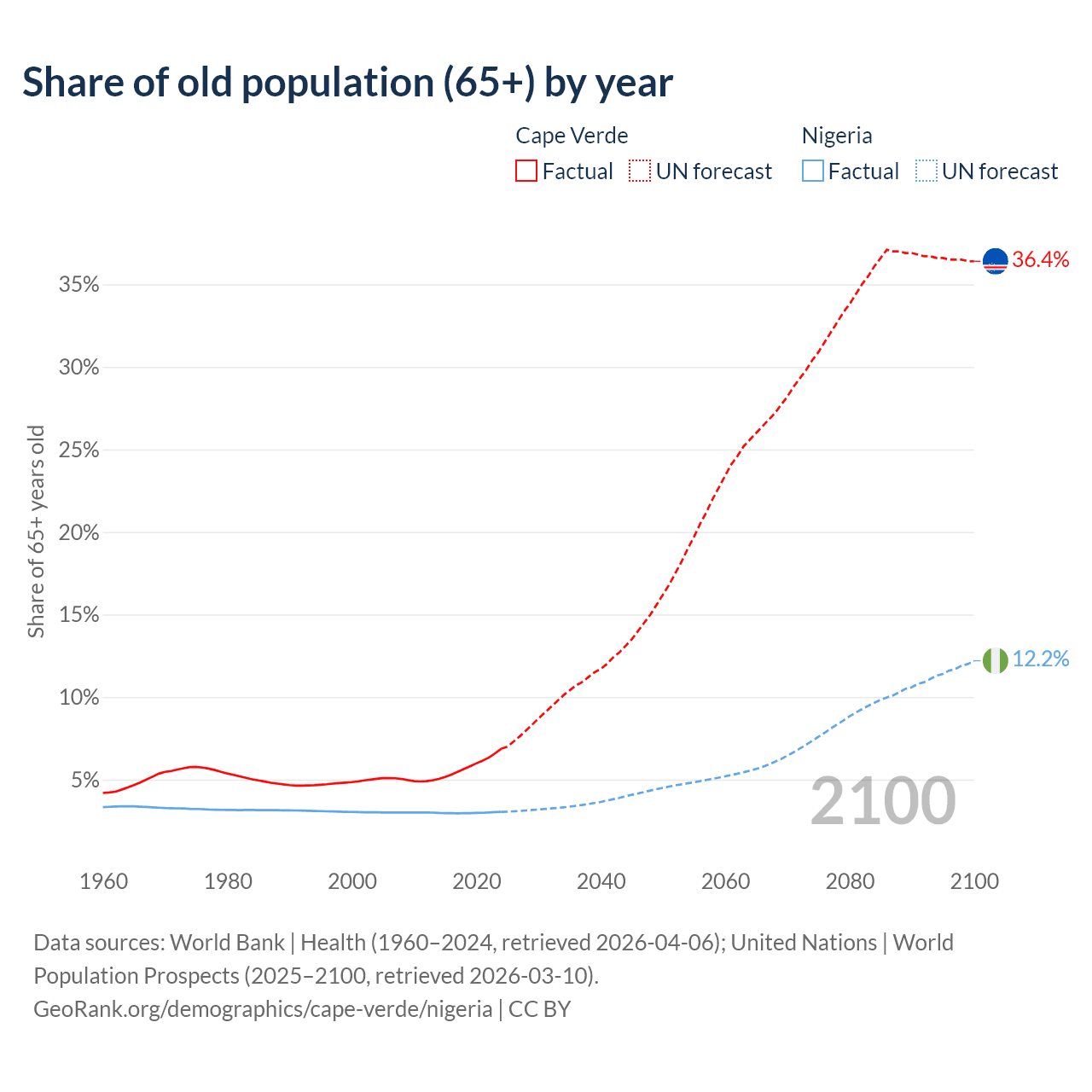 - The share of old-age demographic (65+) in Cape Verde is 6.86% vs 3.05% in Nigeria.