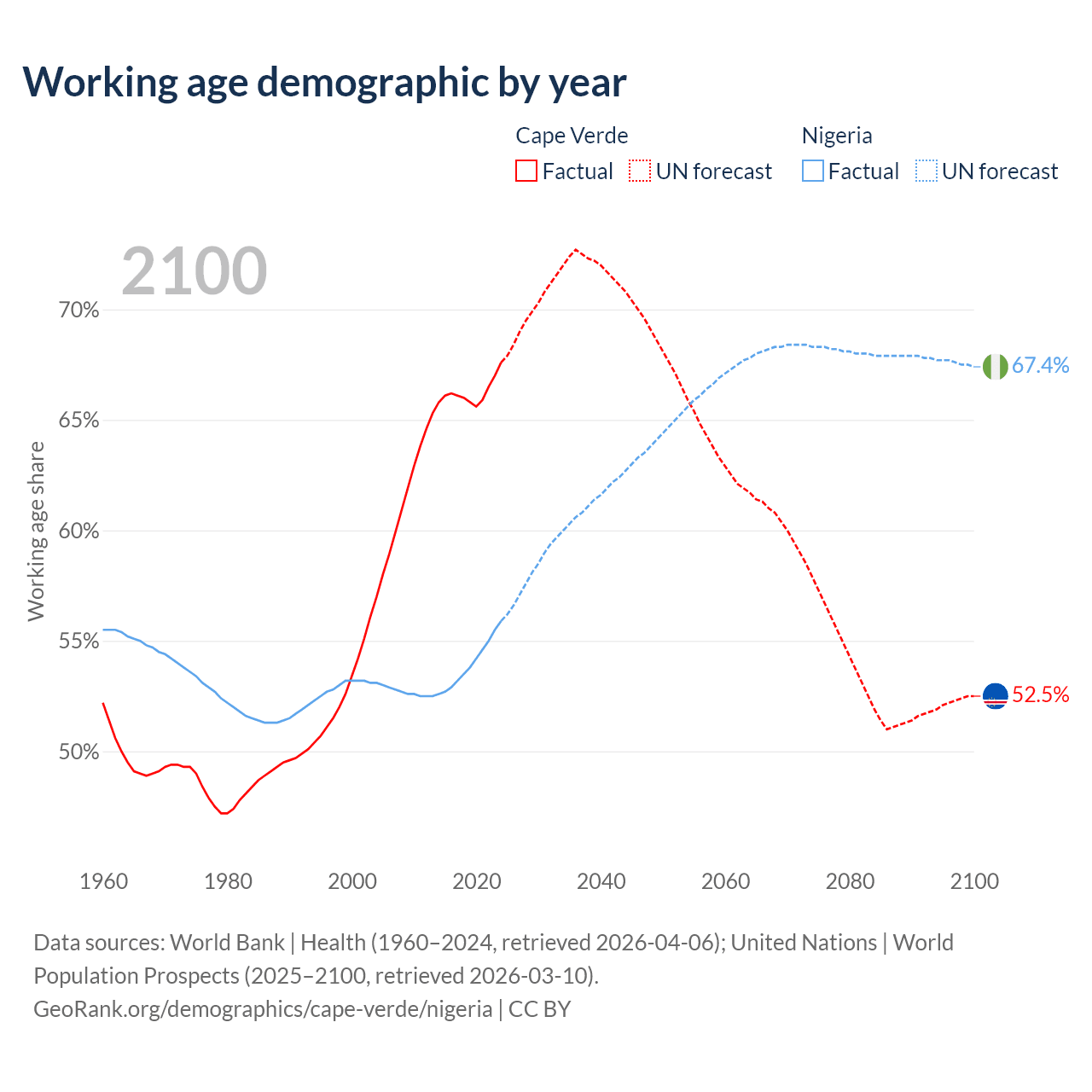- Cape Verde has 359K working age adults (aged 15-64) vs 136M in Nigeria.