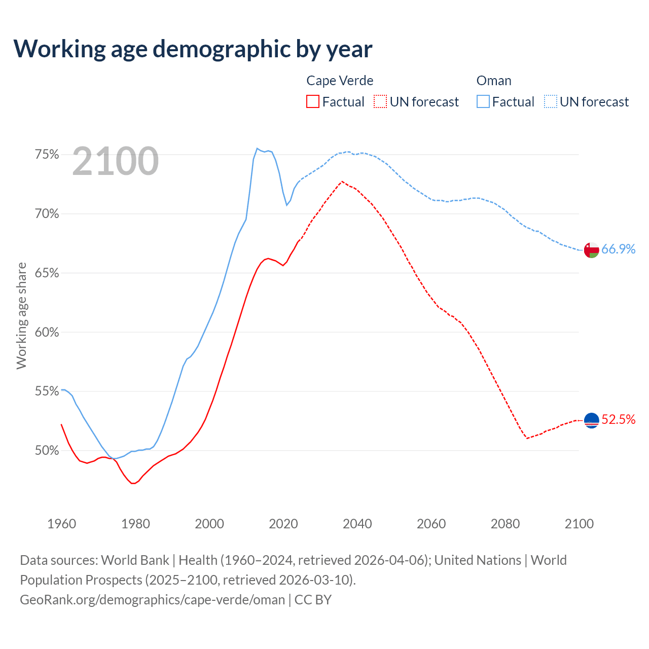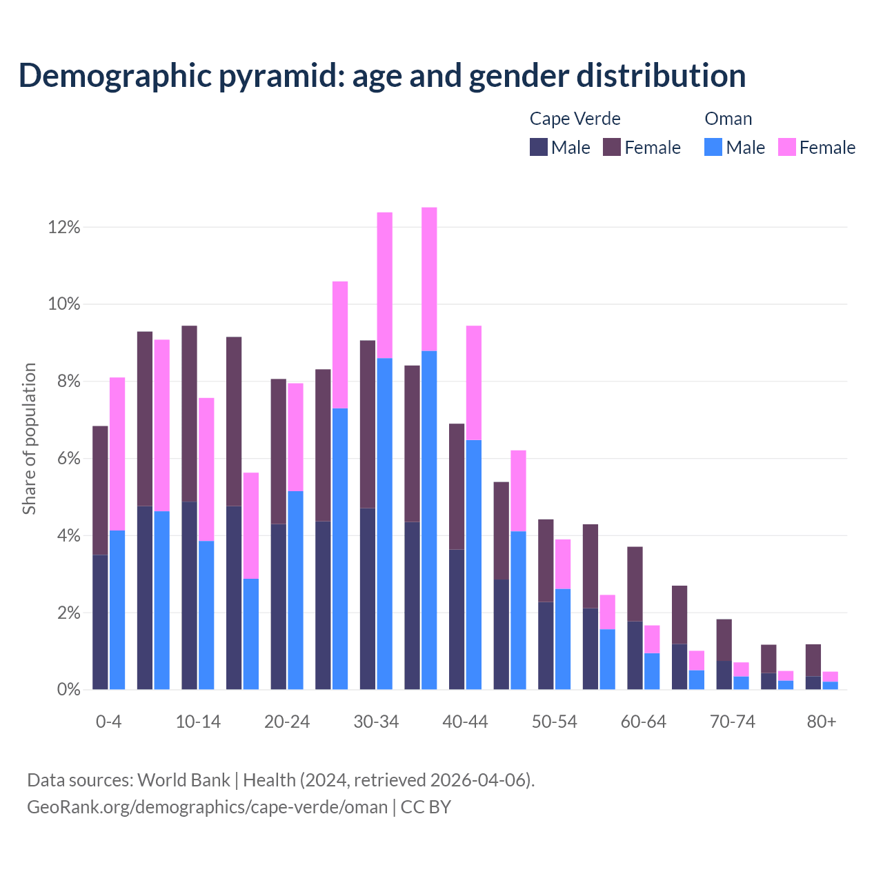 - The share of old-age demographic (65+) in Cape Verde is 6.86% vs 2.64% in Oman.