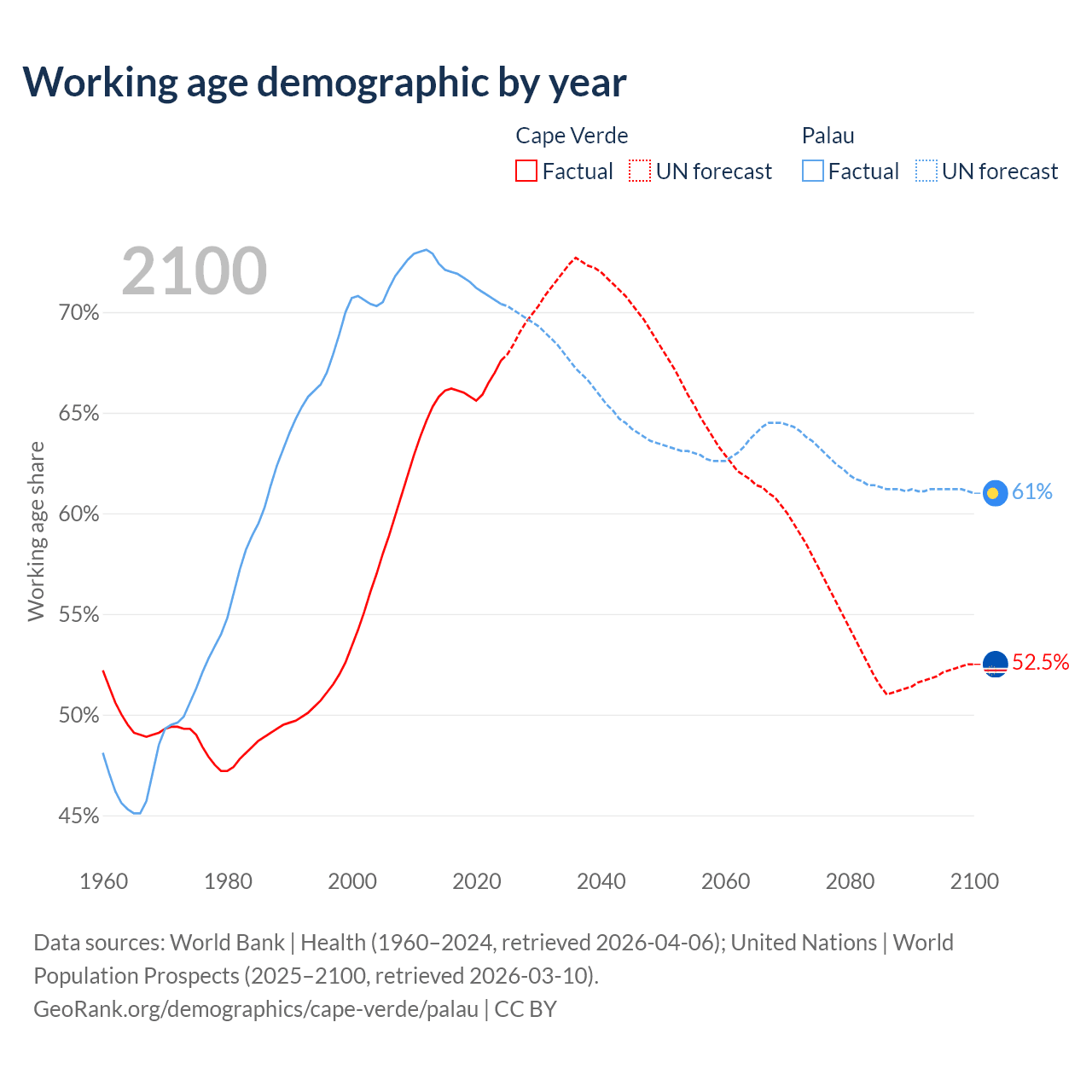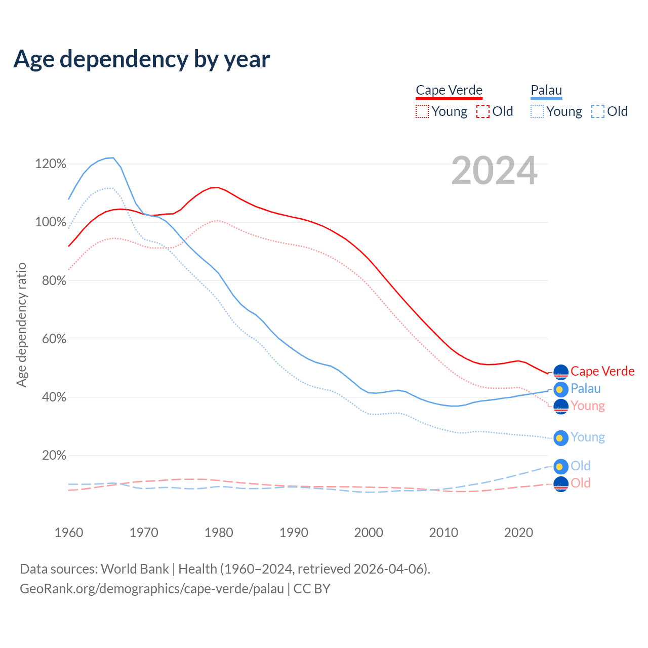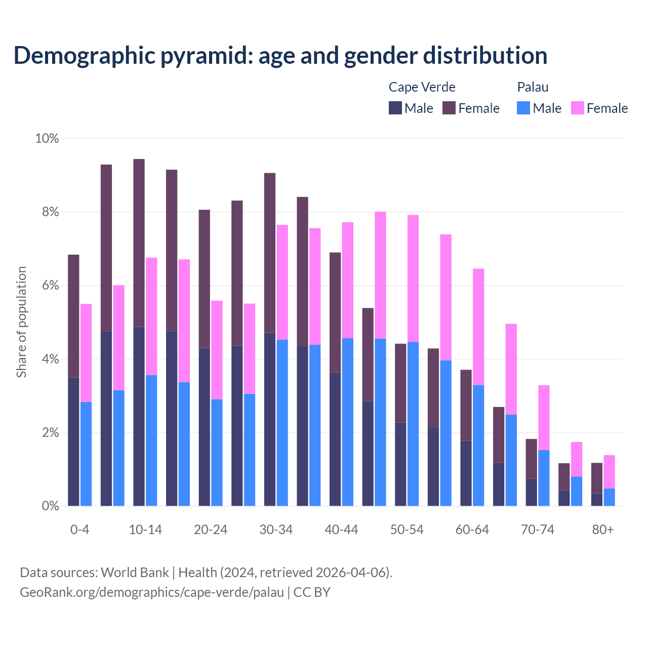 - The share of young demographic (0-15 years old) in Cape Verde is 25.5% vs 18.2% in Palau.