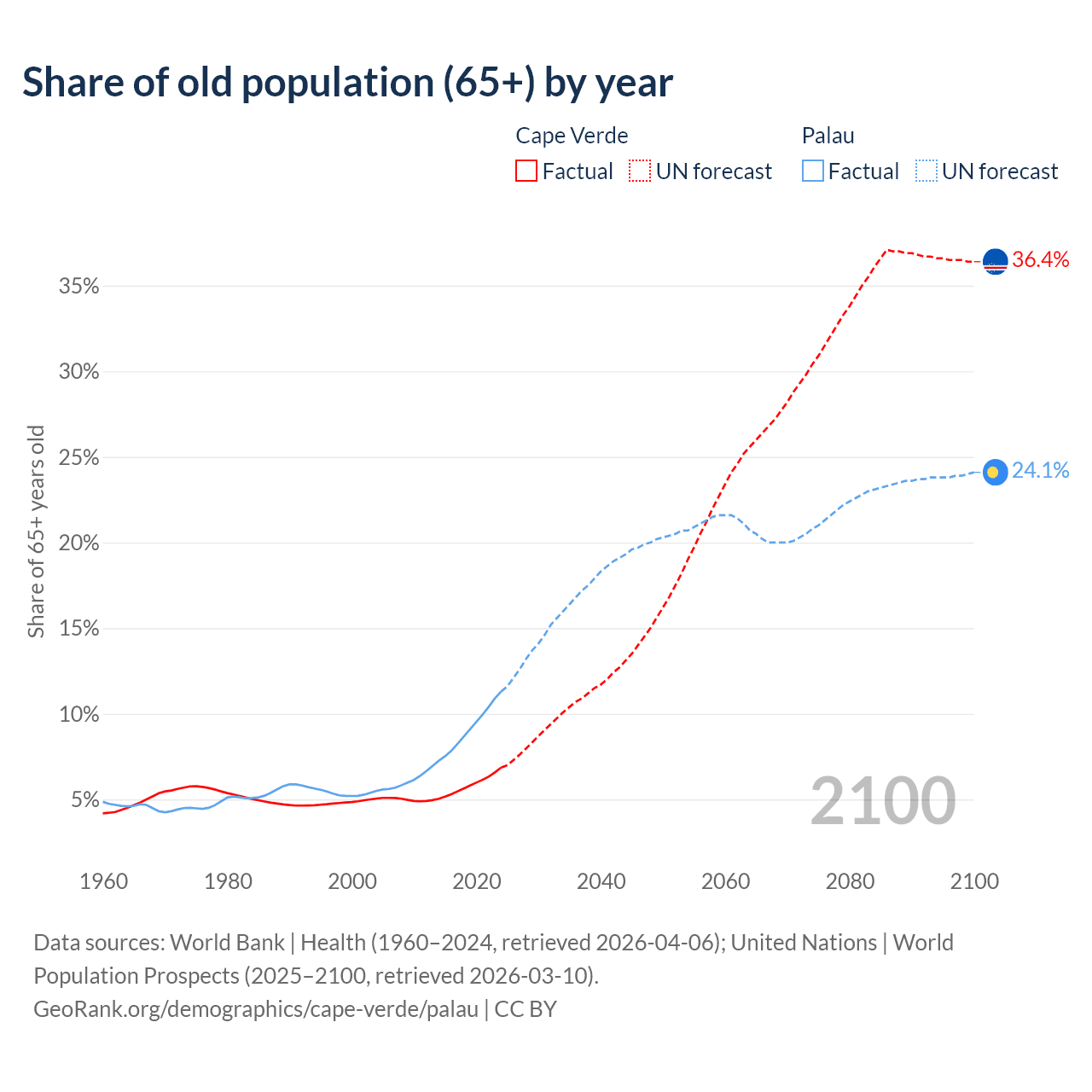 - The share of old-age demographic (65+) in Cape Verde is 6.86% vs 11.3% in Palau.
