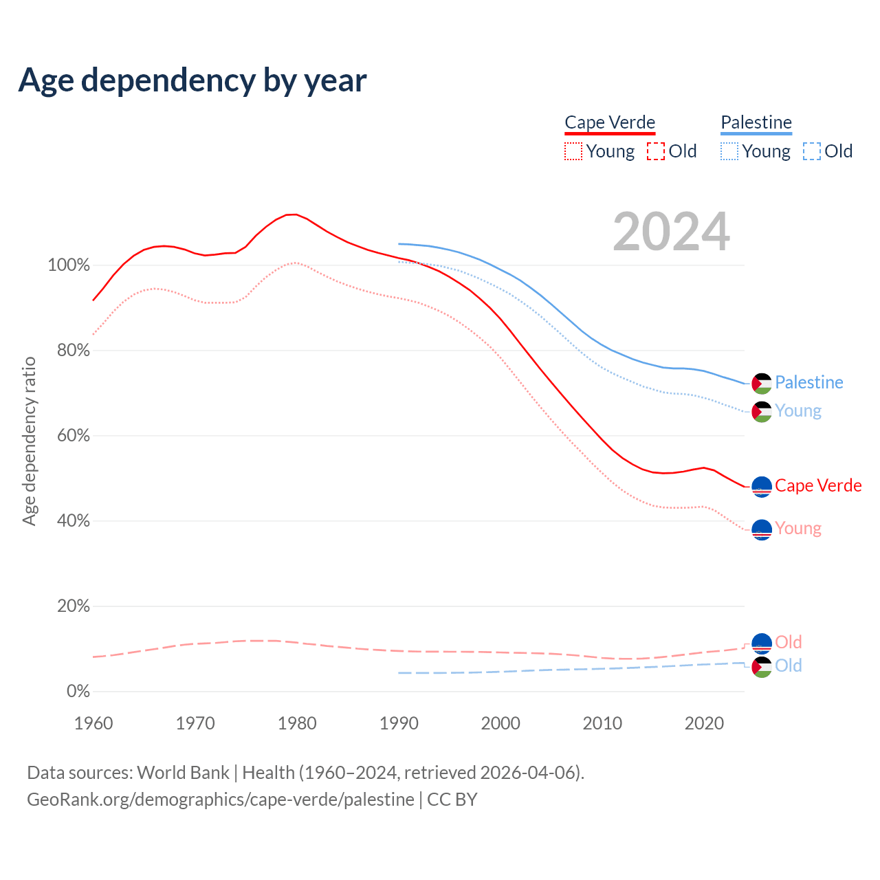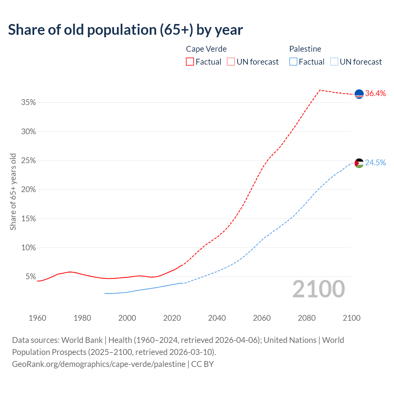 - The share of old-age demographic (65+) in Cape Verde is 6.86% vs 3.84% in Palestine.