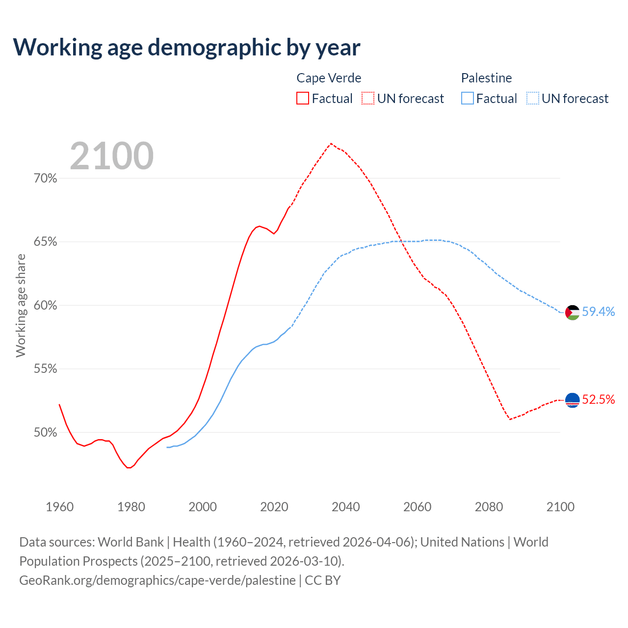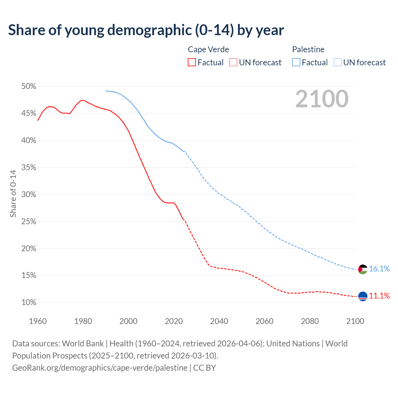 - As of 2026, the population of Cape Verde is 530K vs 5.5M in Palestine - 10.4 times difference.
