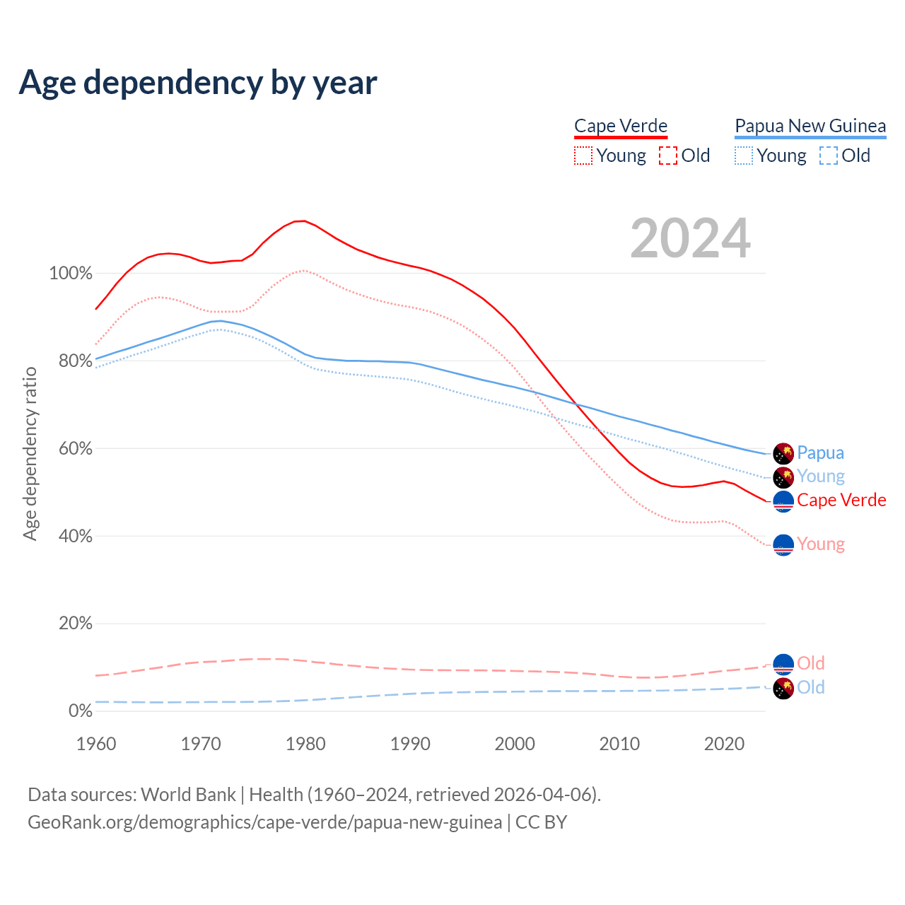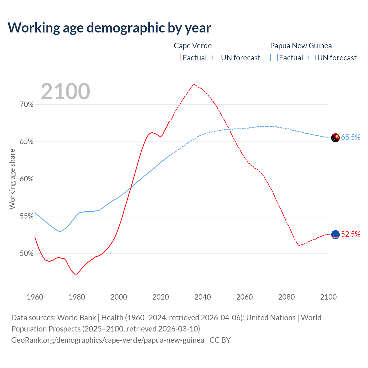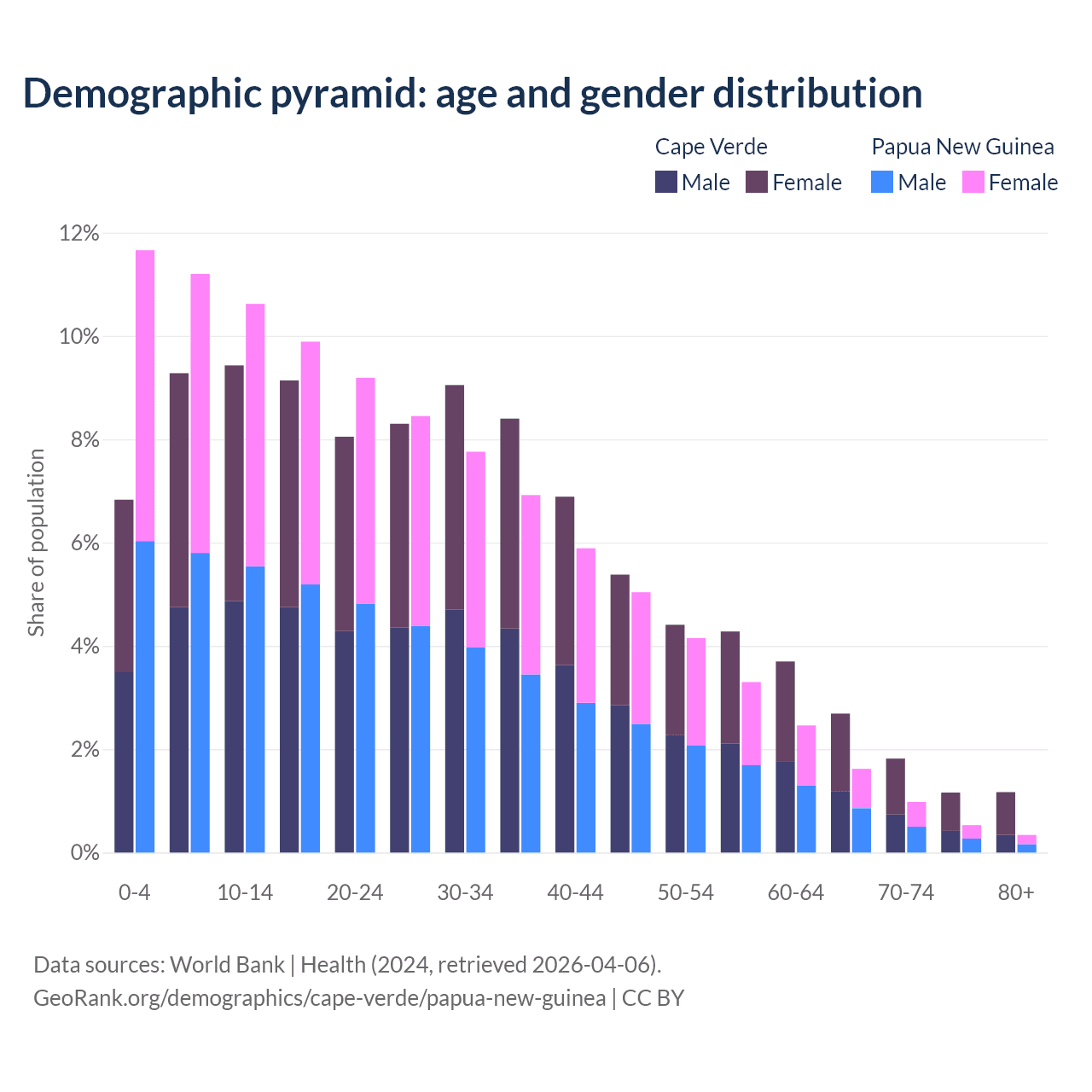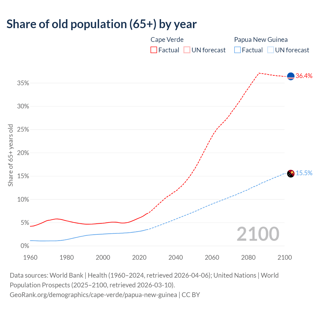 - The share of old-age demographic (65+) in Cape Verde is 6.86% vs 3.46% in Papua New Guinea.
