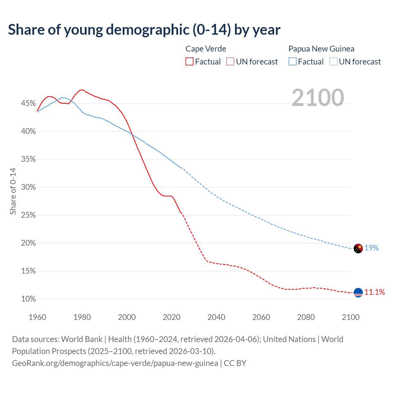 - The share of young demographic (0-15 years old) in Cape Verde is 25.5% vs 33.5% in Papua New Guinea.