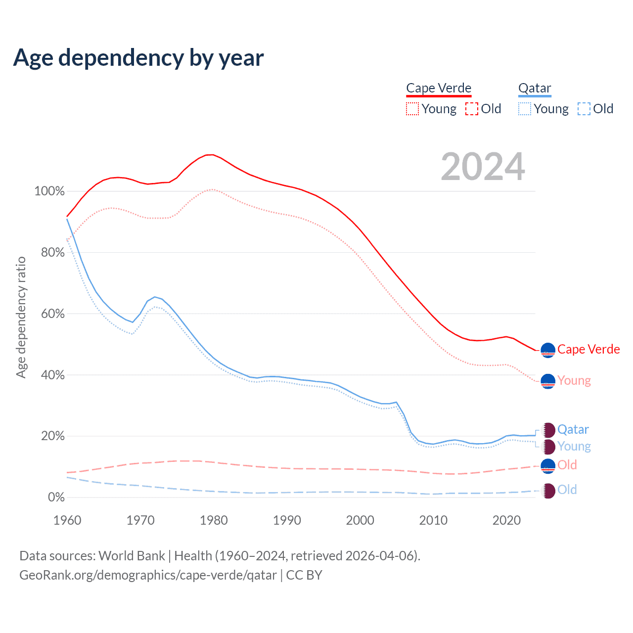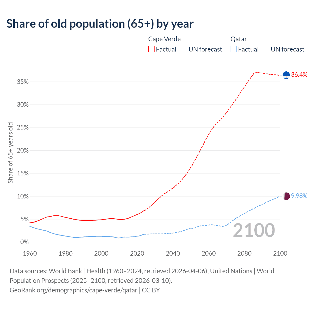 - The share of old-age demographic (65+) in Cape Verde is 6.86% vs 1.68% in Qatar.