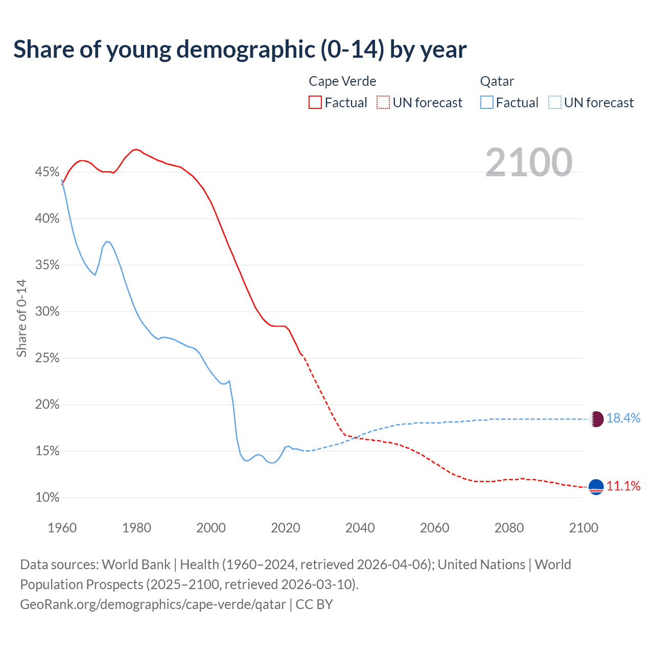 - The share of young demographic (0-15 years old) in Cape Verde is 25.5% vs 15.1% in Qatar.