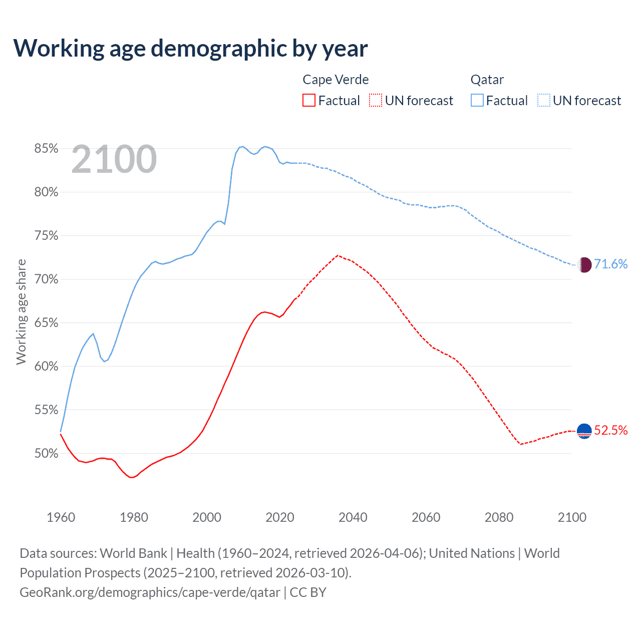 Median age Cape Verde vs Qatar, 1960-2100