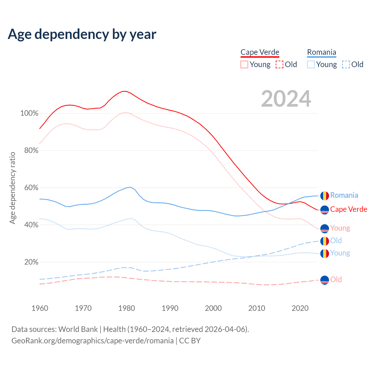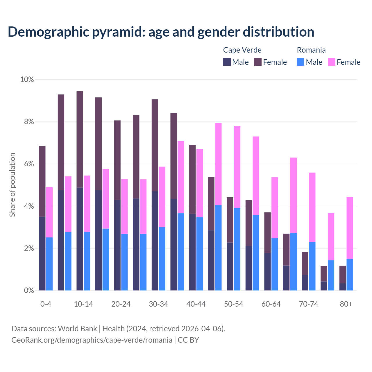 - Cape Verde is ranked 110/196 by median age (oldest to youngest) vs 23/196 for Romania.