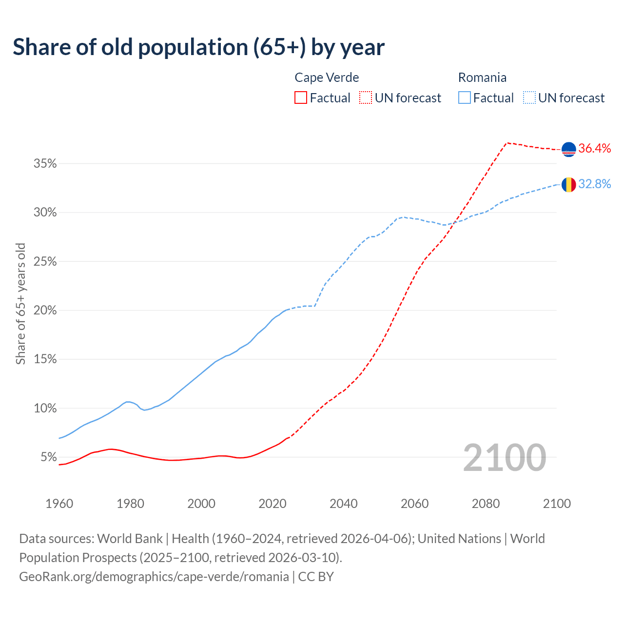 The share of older people aged 65 and over is 6.86% in Cape Verde and 20% in Romania. Life expectancy in Cape Verde compared to Romania .