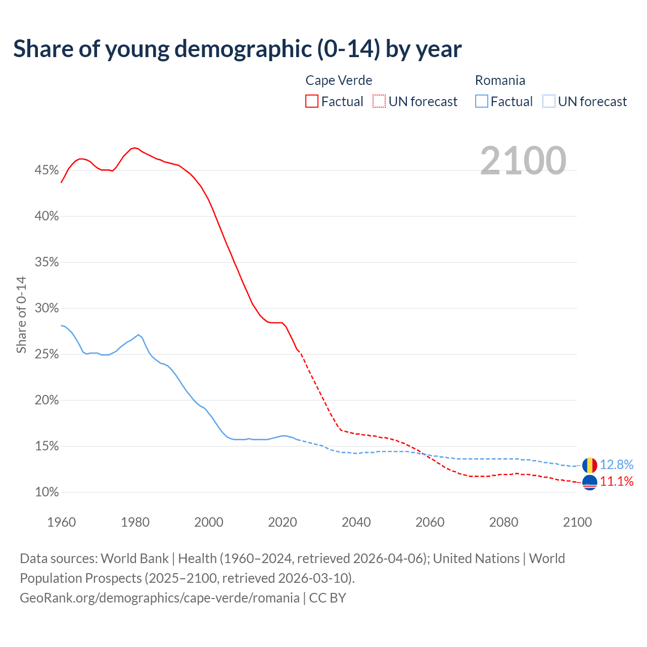 - The share of young demographic (0-15 years old) in Cape Verde is 25.5% vs 15.7% in Romania.