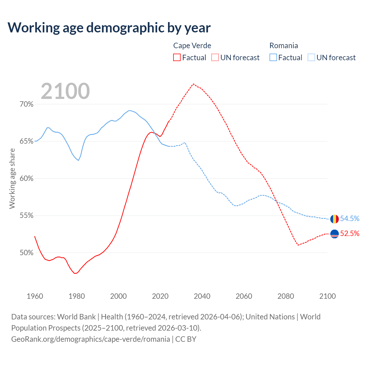 - Cape Verde has 359K working age adults (aged 15-64) vs 12.1M in Romania.