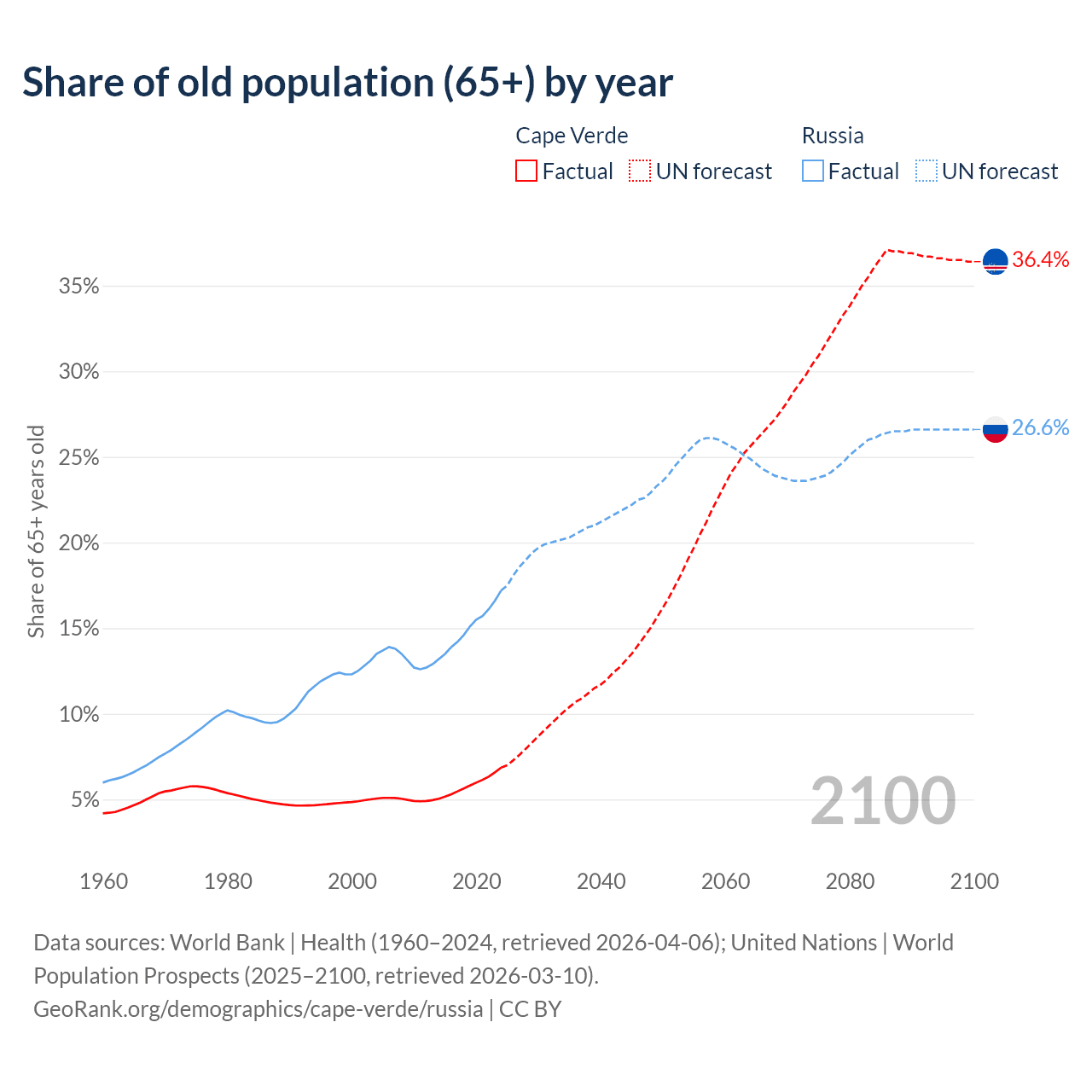 The share of older people aged 65 and over is 6.86% in Cape Verde and 17.2% in Russia. Life expectancy in Cape Verde compared to Russia .