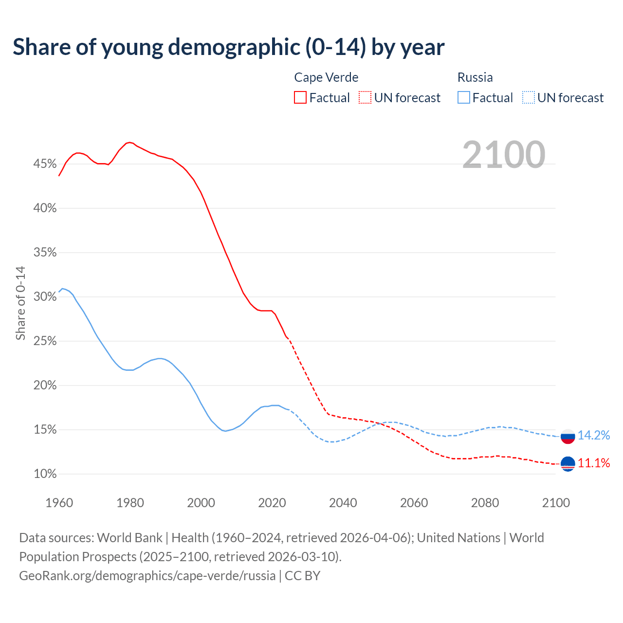 - The share of young demographic (0-15 years old) in Cape Verde is 25.5% vs 17.3% in Russia.