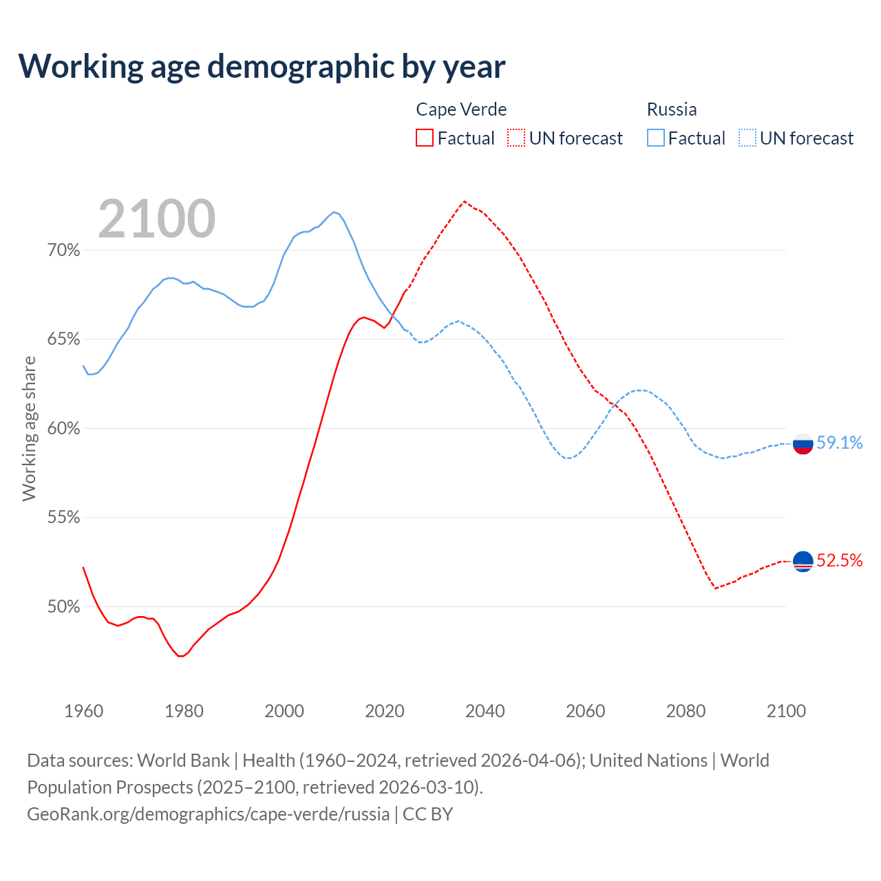 - Cape Verde has 359K working age adults (aged 15-64) vs 93M in Russia.