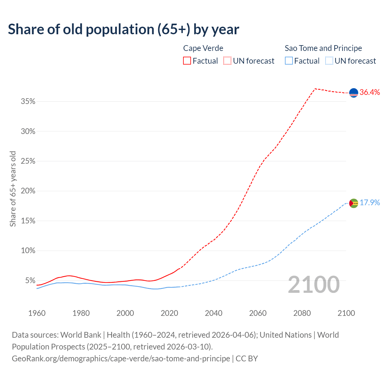 The share of older people aged 65 and over is 6.86% in Cape Verde and 3.9% in Sao Tome and Principe. Life expectancy in Cape Verde compared to Sao Tome and Principe .
